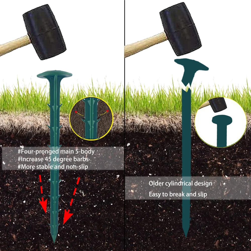 Lawn edging stakes uses a reversed thorns design, each face has barbs, which can be more firmly fixed on the ground, that are strong and durable. Anchoring spikes are easy to use and can be used in a variety of soil types.