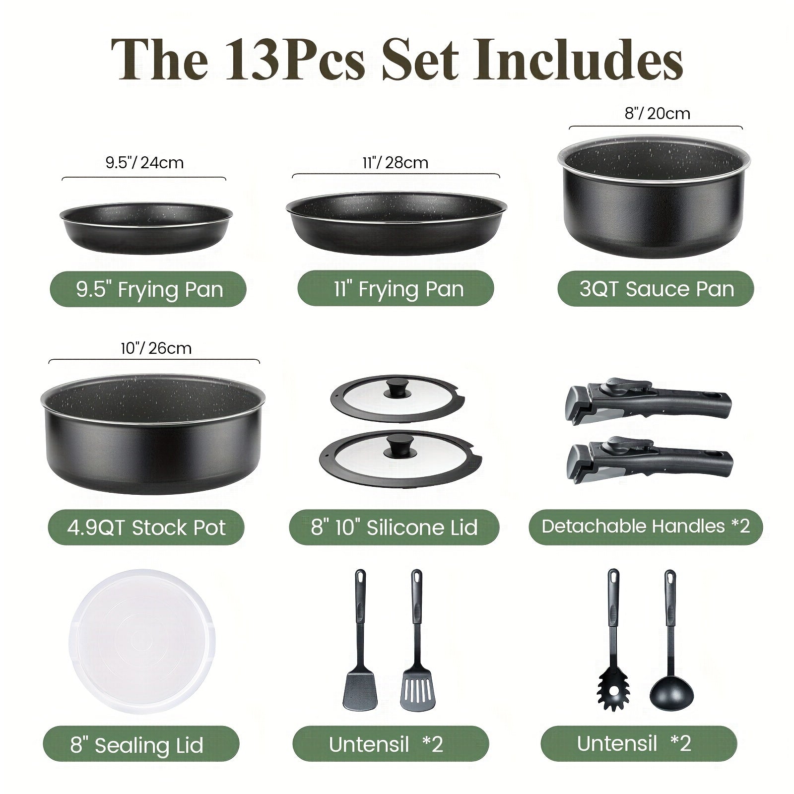 13pcs Kitchen Pots and Pans Set Nonstick, Cookware Sets with Detachable Handles,