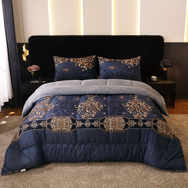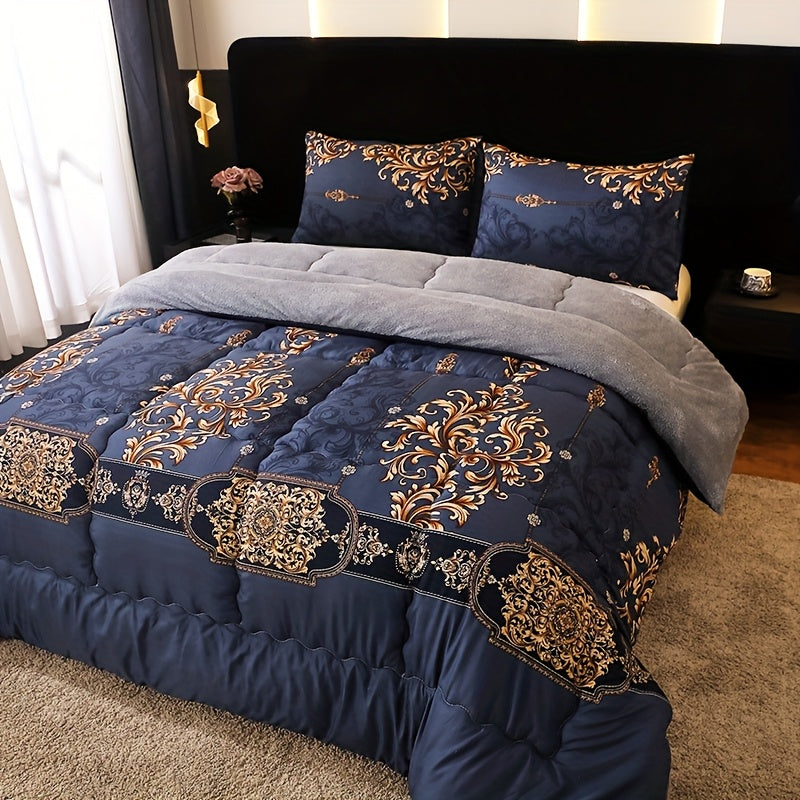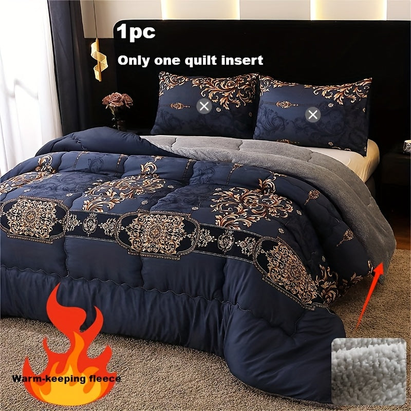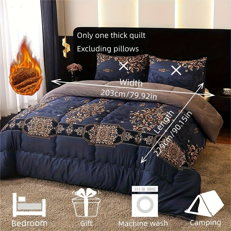 1pc Luxury Fleece Bedspread - Deep Navy Blue & Golden Floral Print, All-Season Soft Warmth