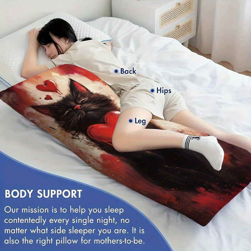 1pc Whimsical Black Cat Design Full Body Pillow with Zipper Headrest - Vibrant Red & White Artwork