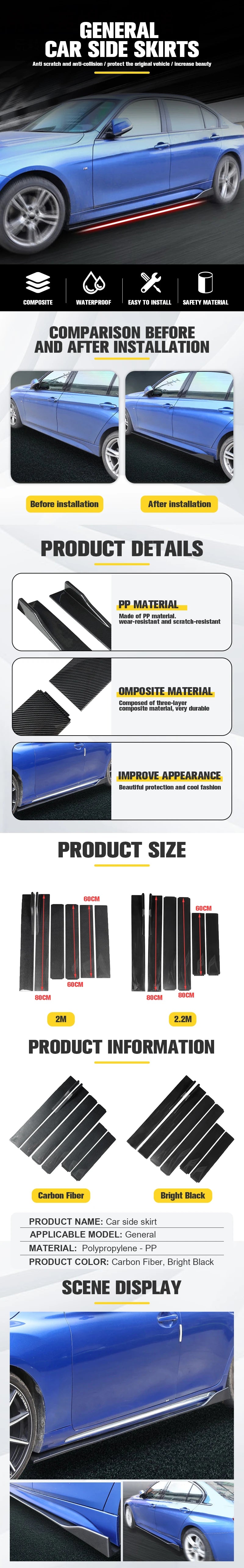 Special Features: 1 Pair 2M Universal Side Skirts Extension Rocker Panels Lip Splitters