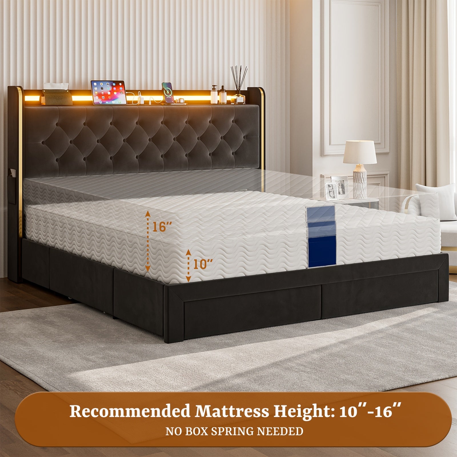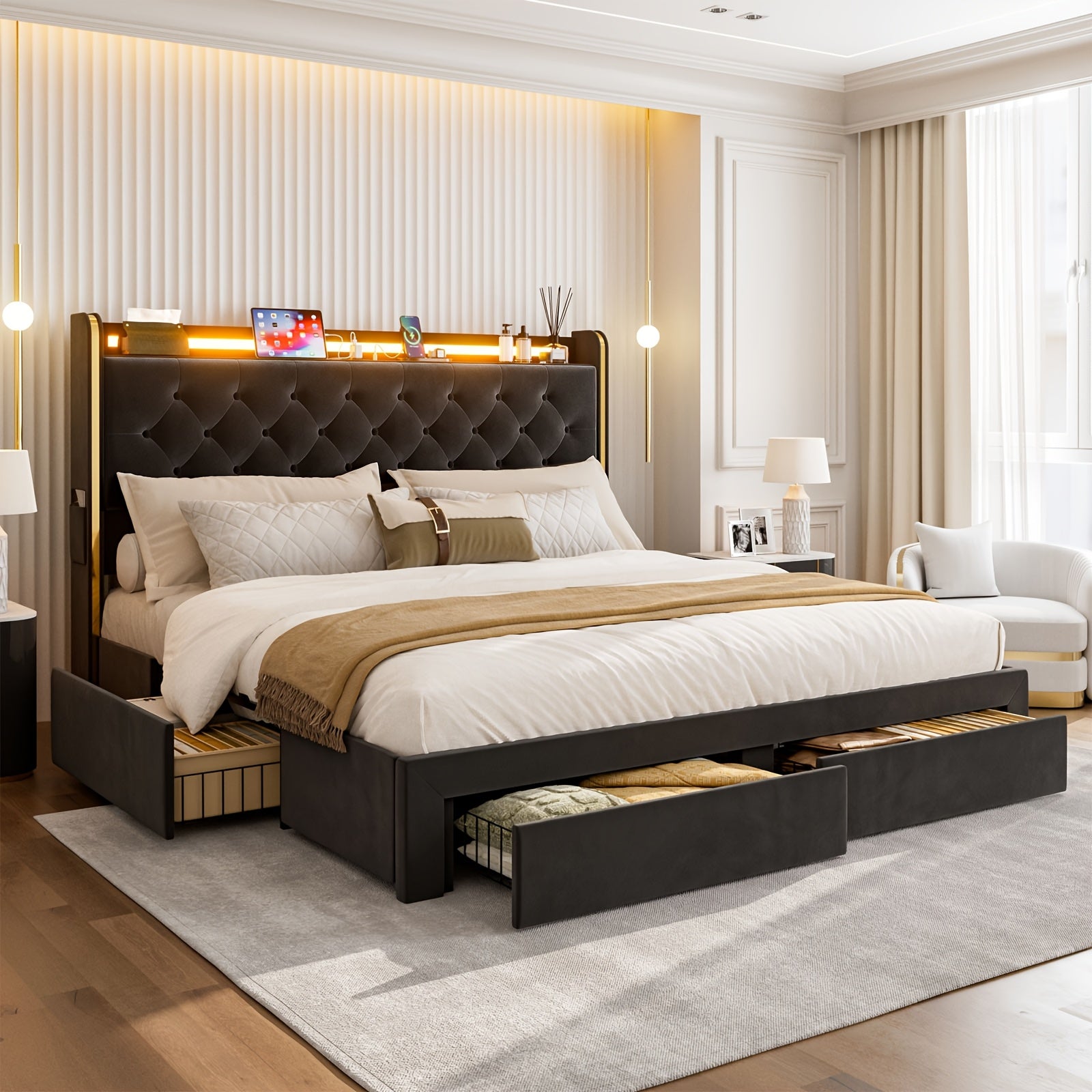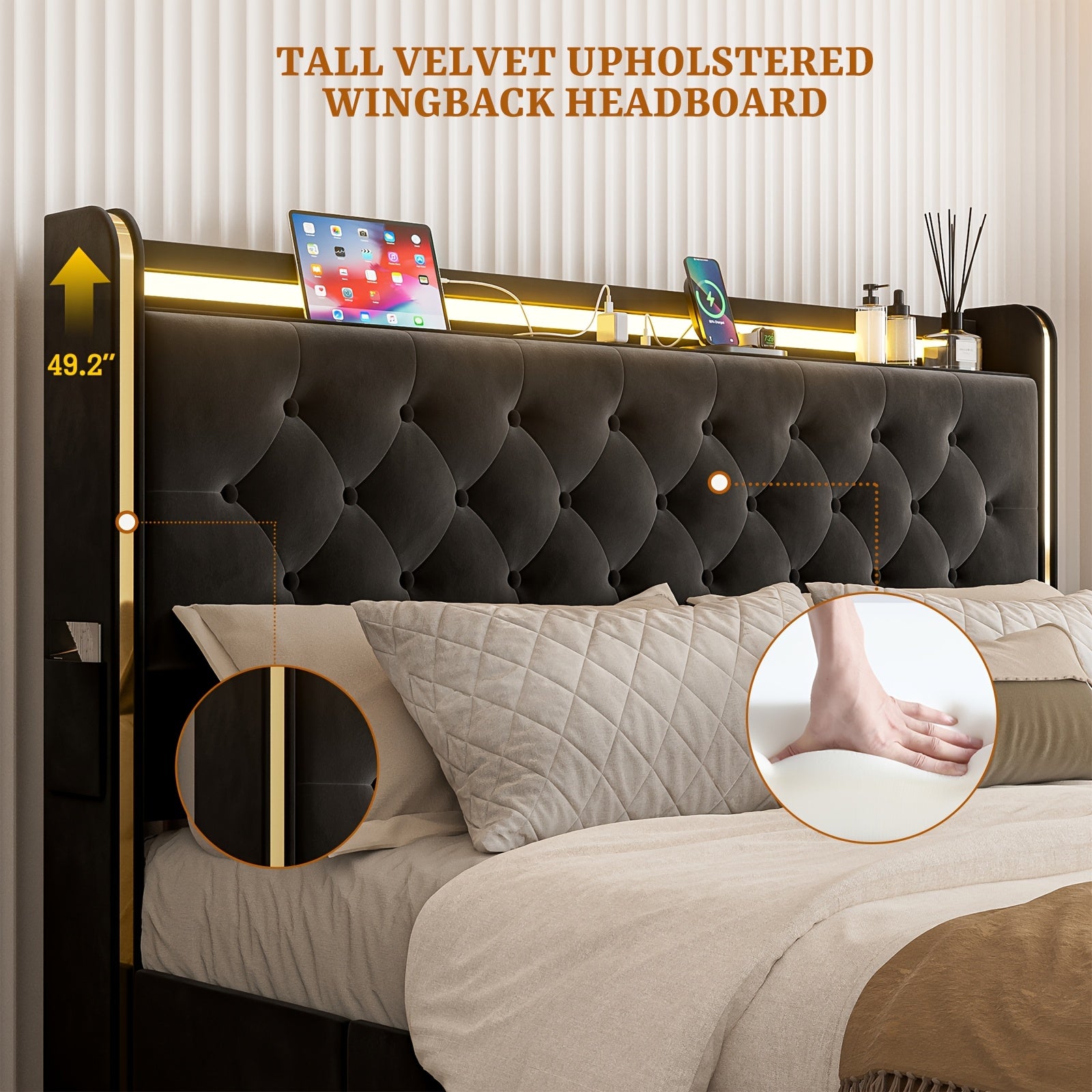 49.2" Tall Bed Frames with 4 Drawers, Velvet Platform Bed with Wingback Storage Headboard,