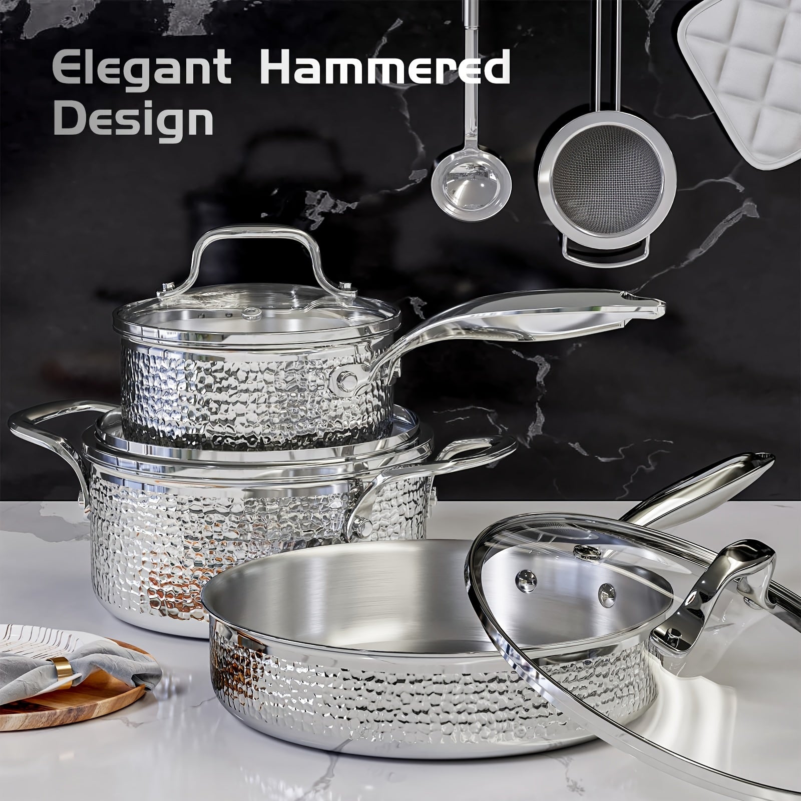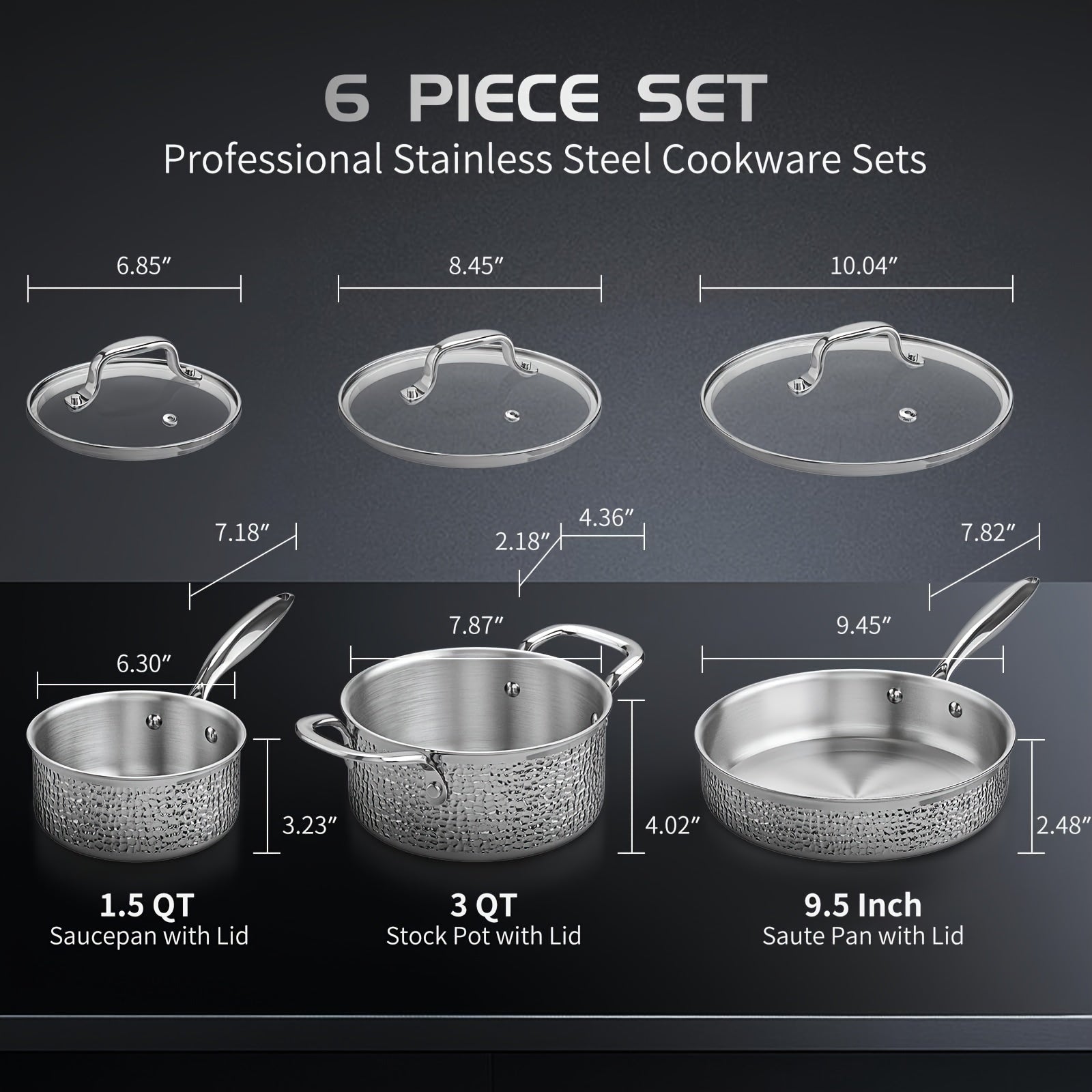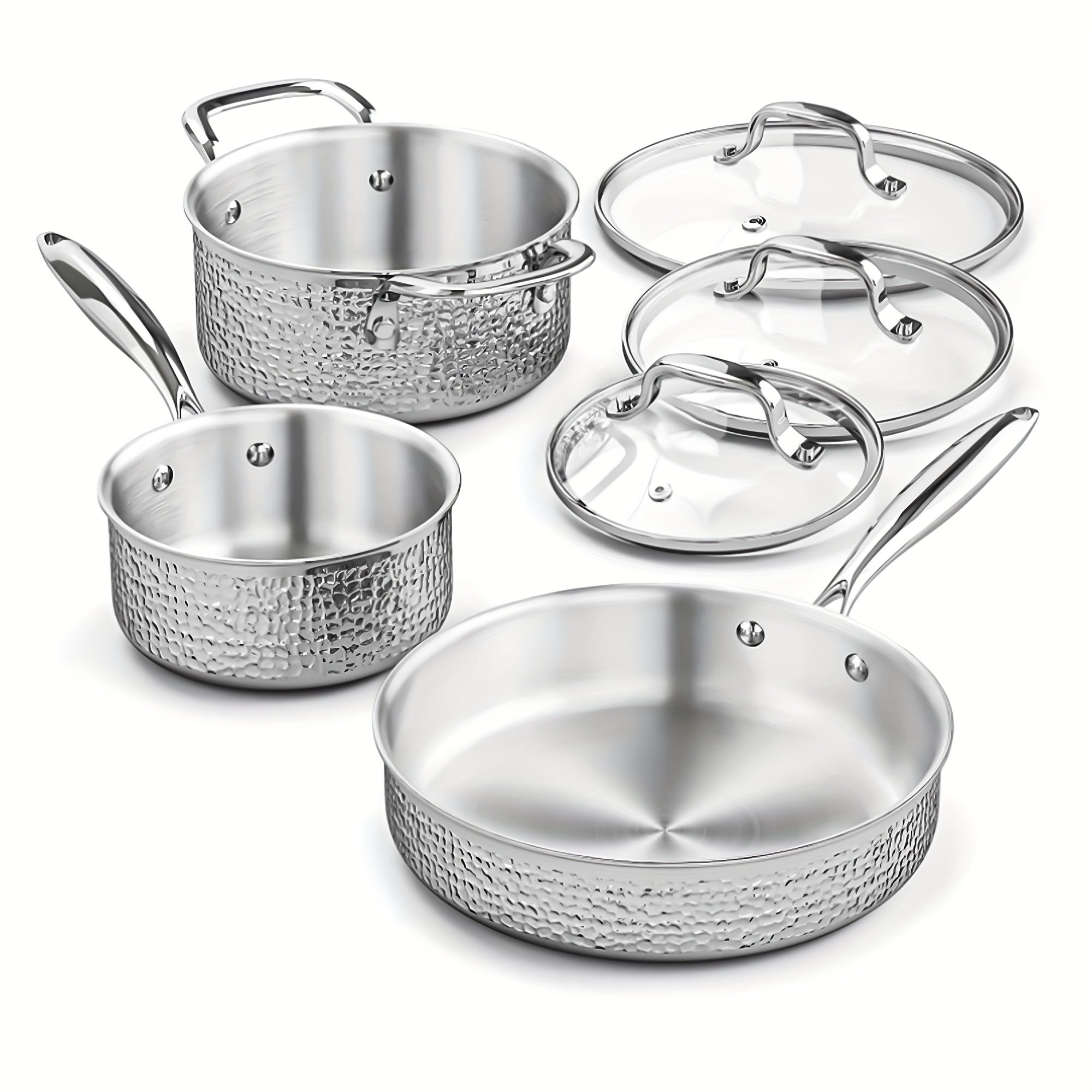 6pcs Hammered Cookware Set, Stainless Steel Pots And Pans Set With Tempered Glass Lids,