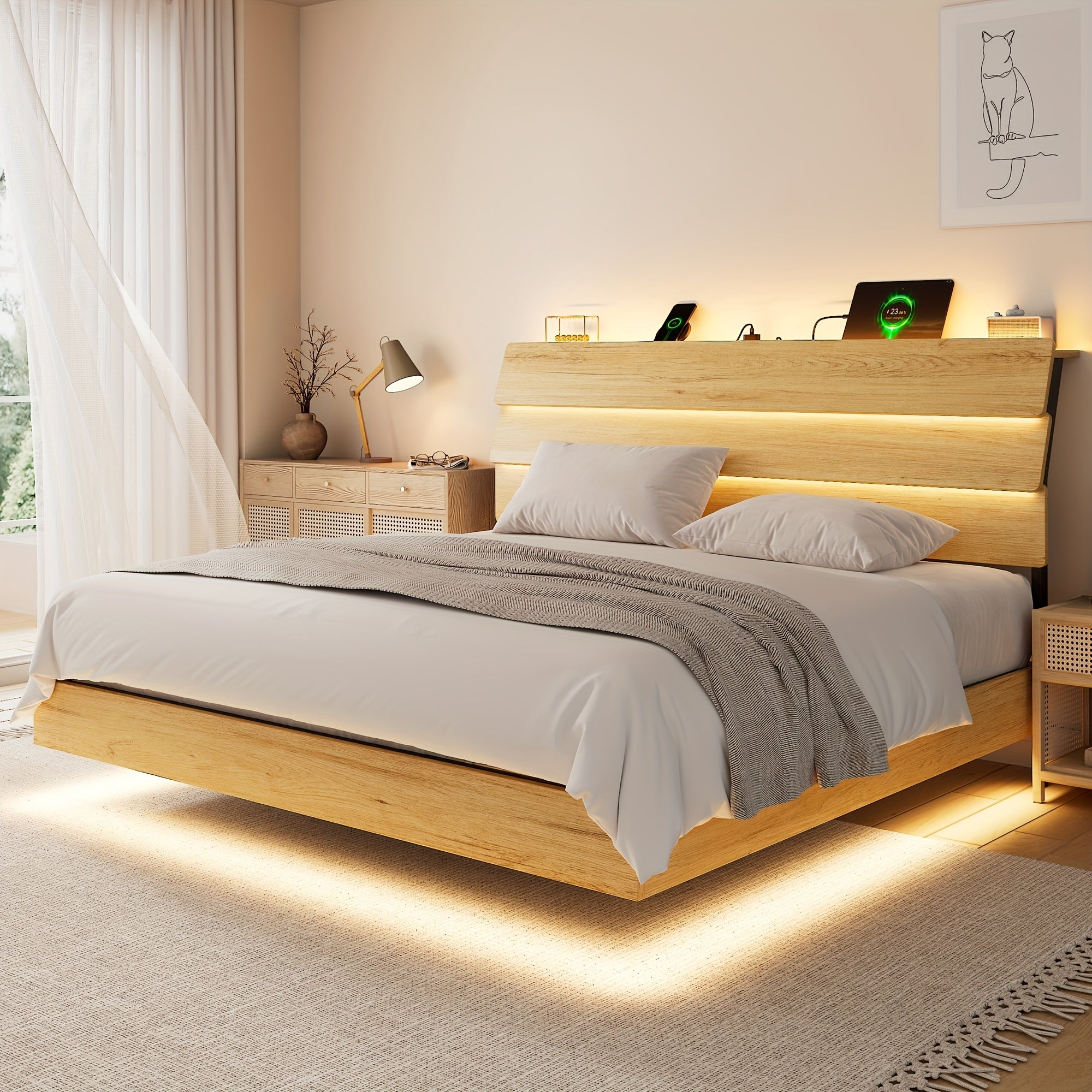 Bed Frame Featuring LED Lighting, Integrated Charging Station, Wooden Headboard for Storage