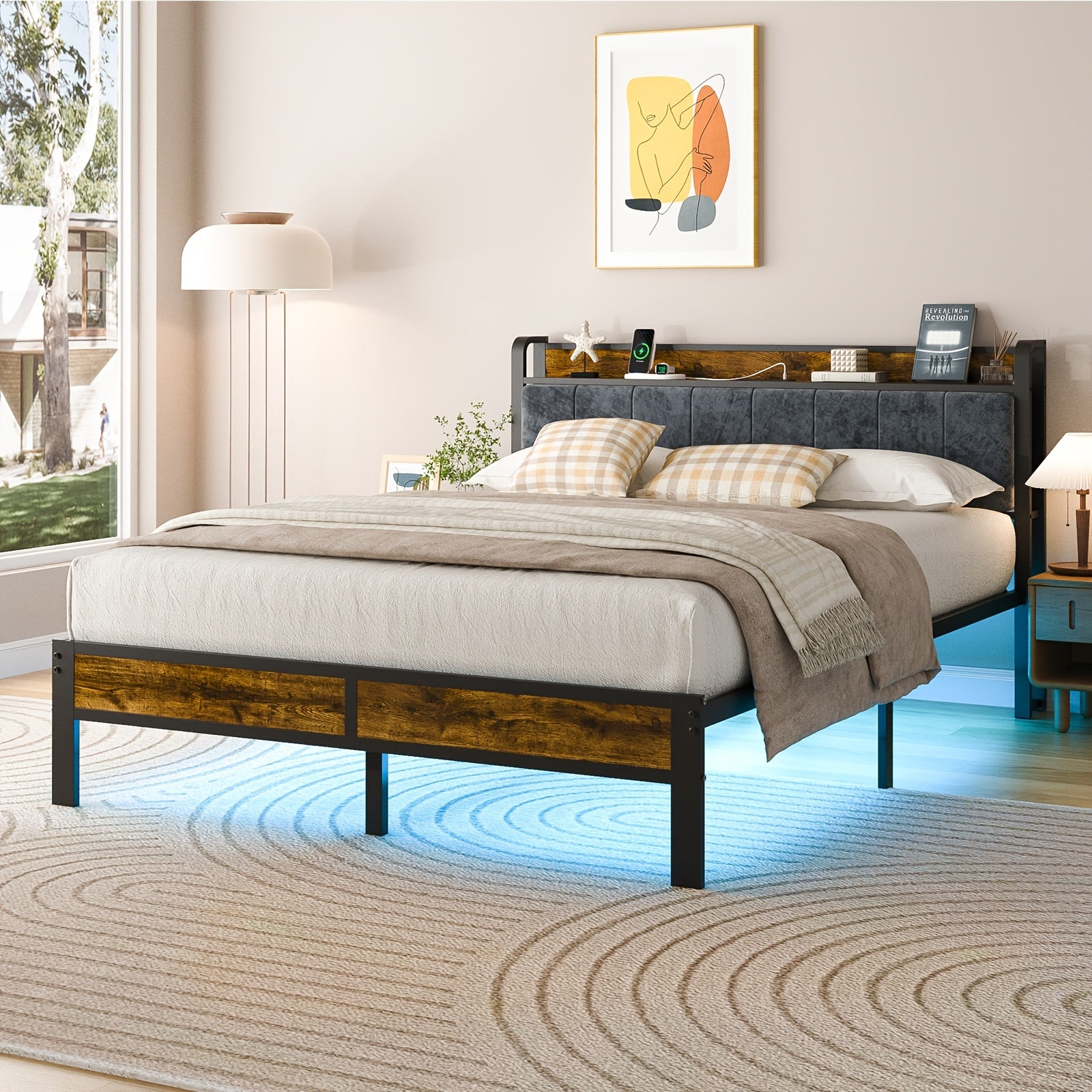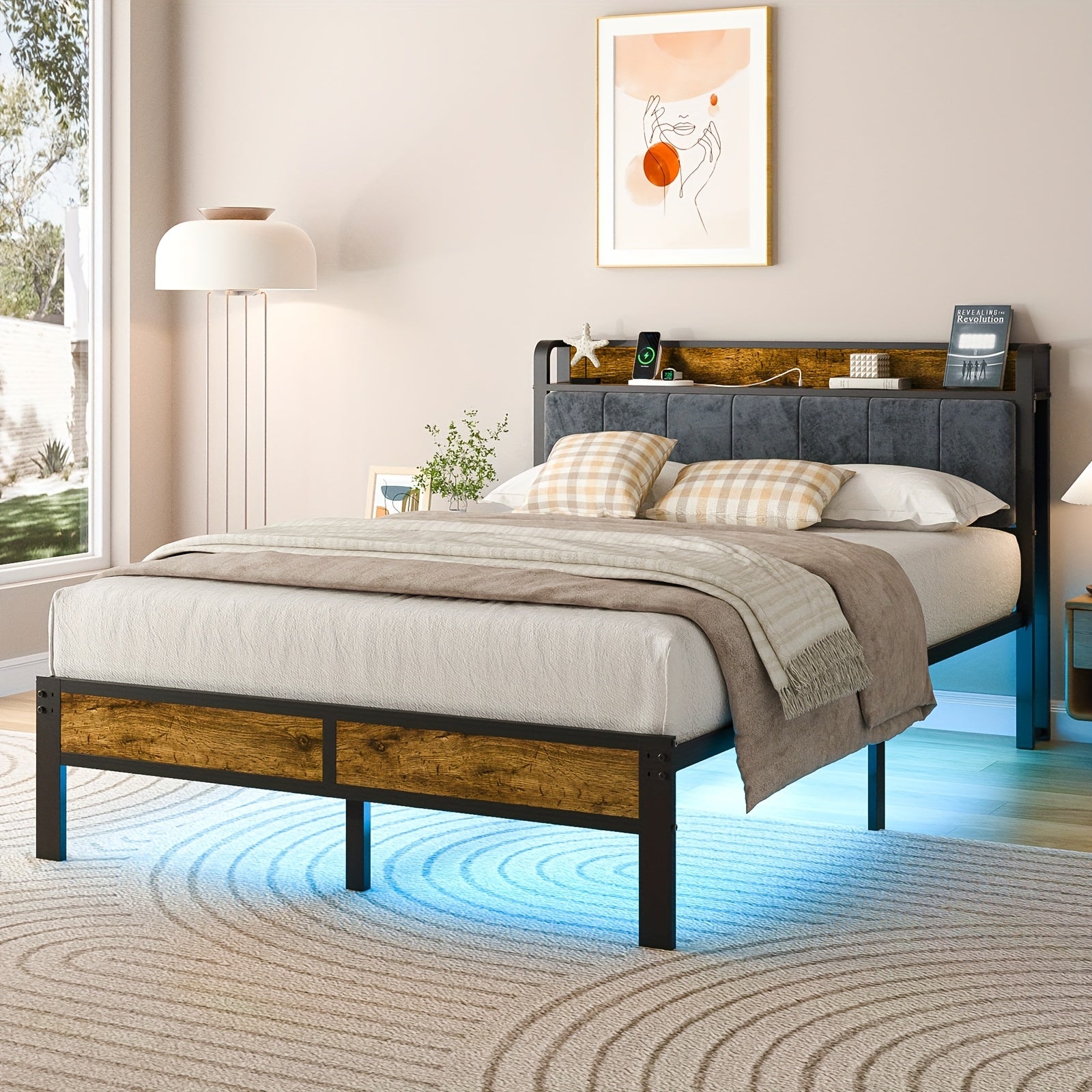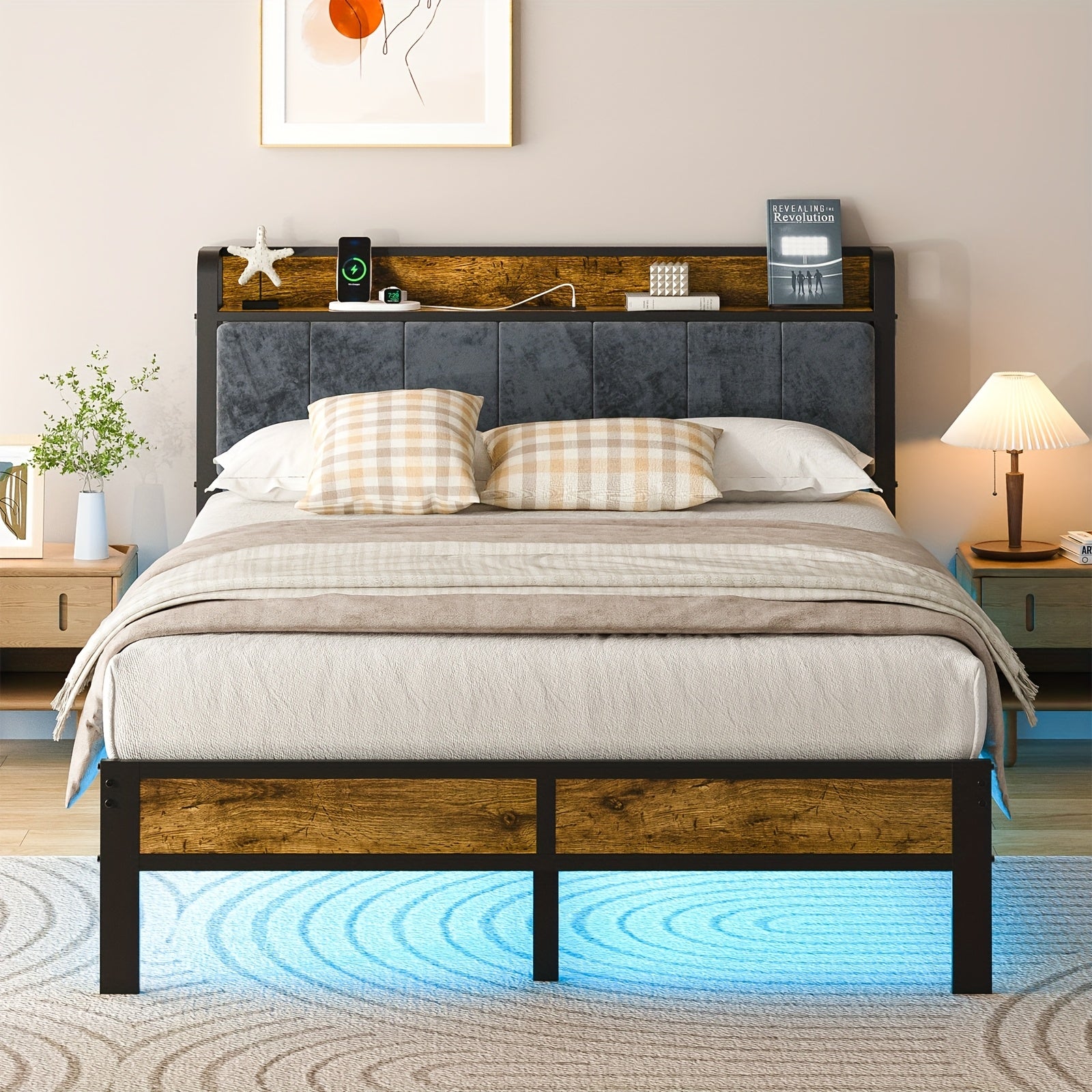 Bed Frame LED Metal Platform Bed with Storage Headboard And USB Charging Station,