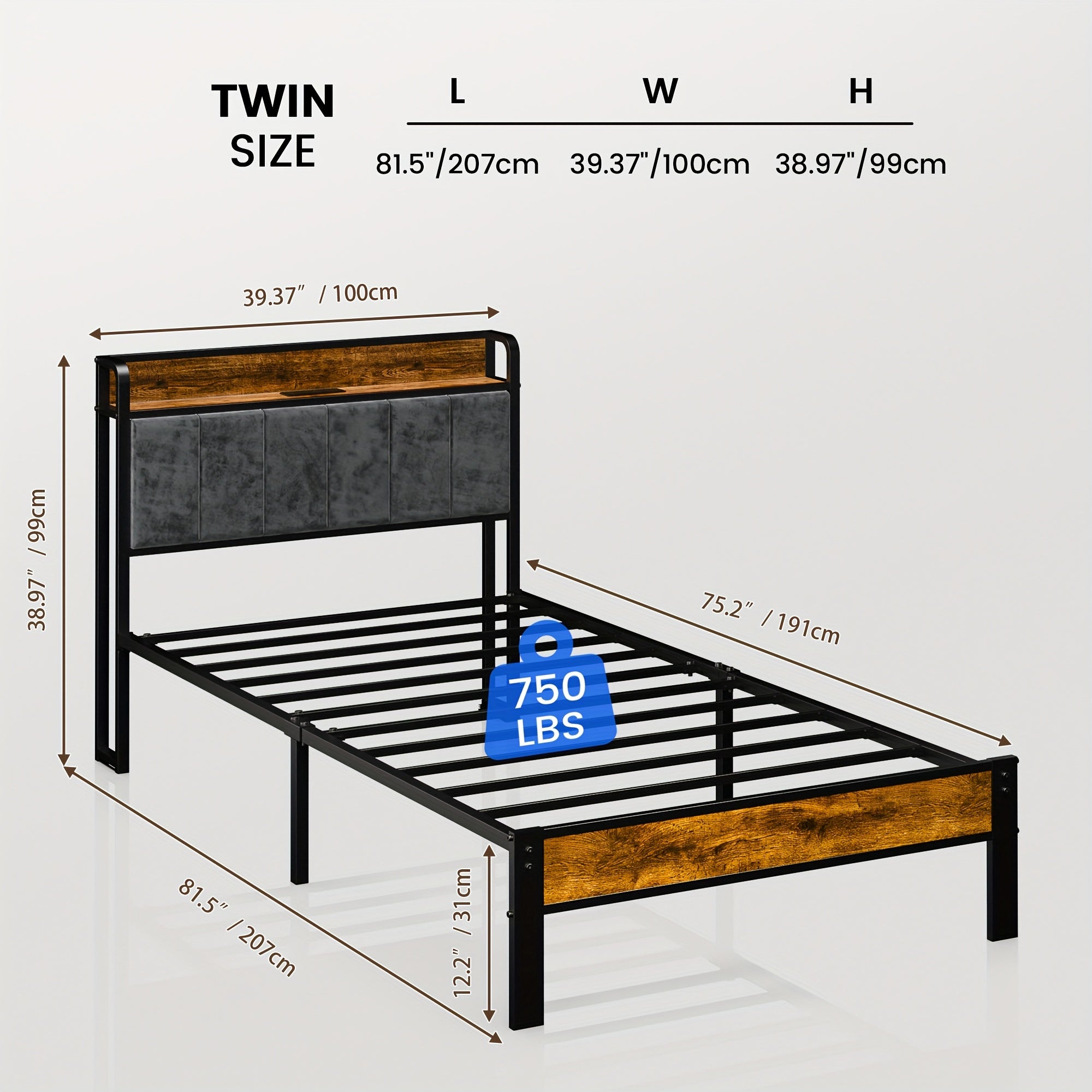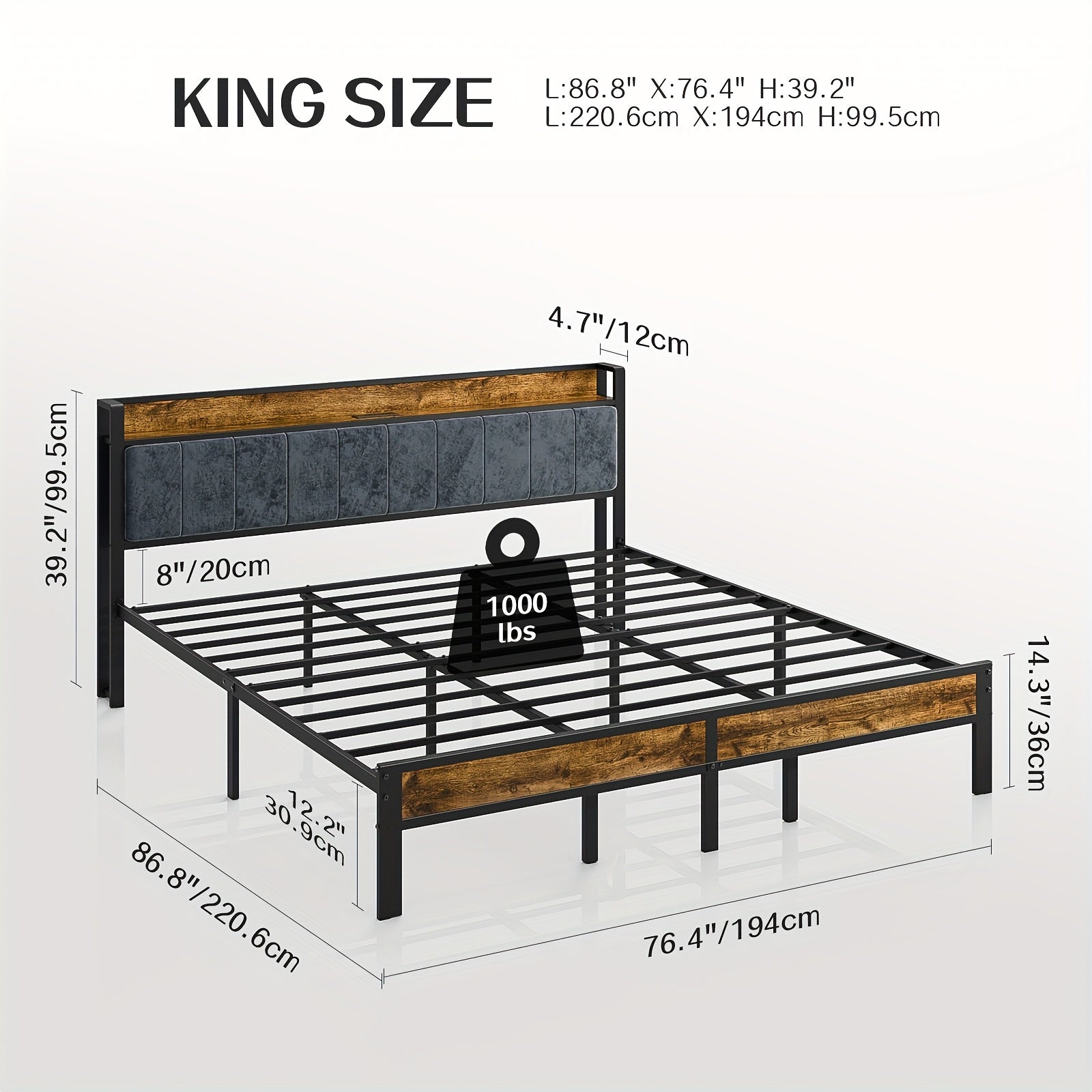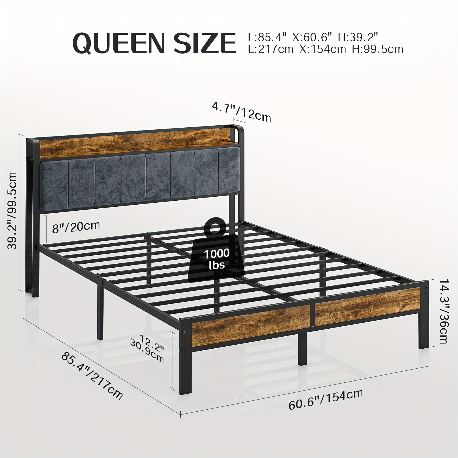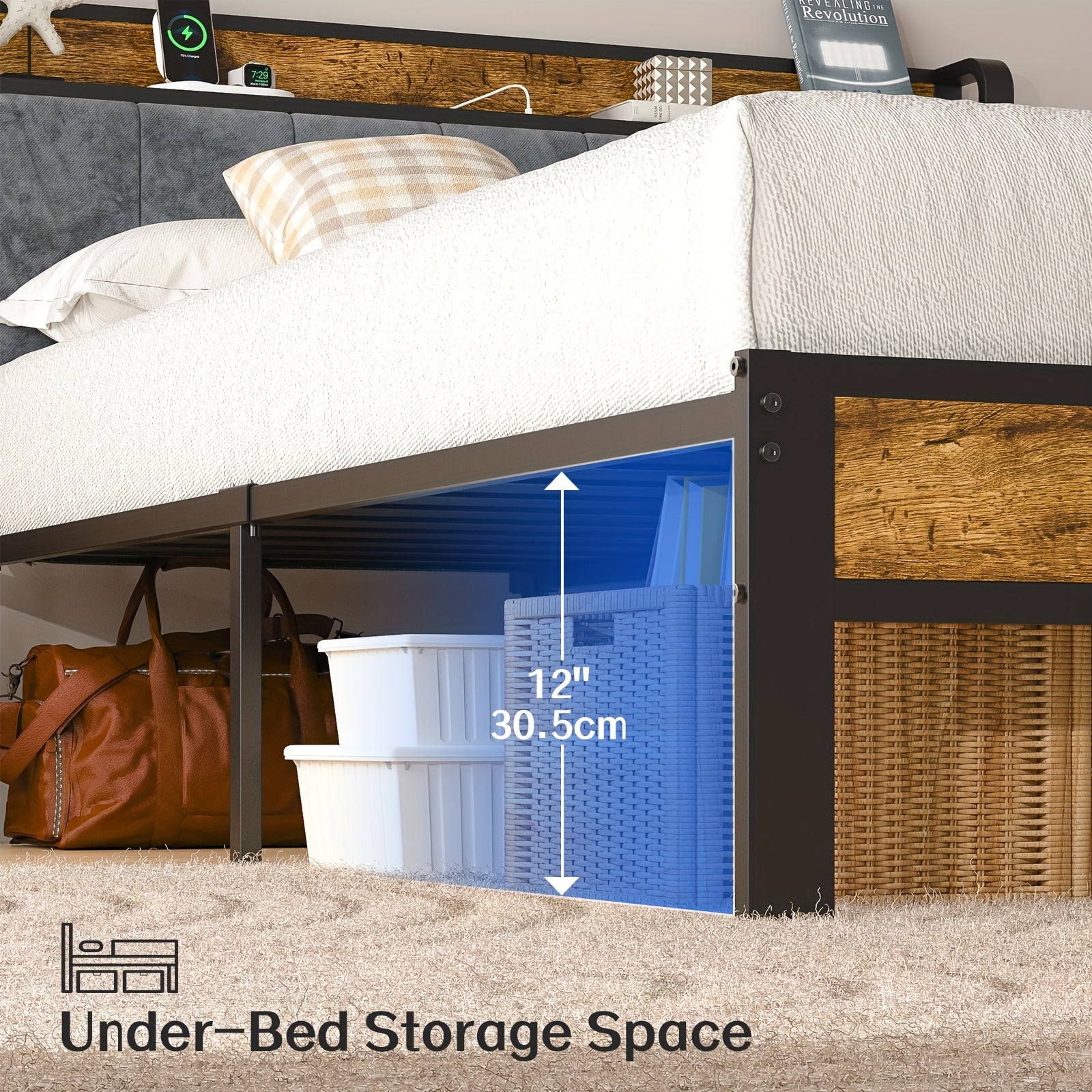 Bed Frame LED Metal Platform Bed with Storage Headboard And USB Charging Station,