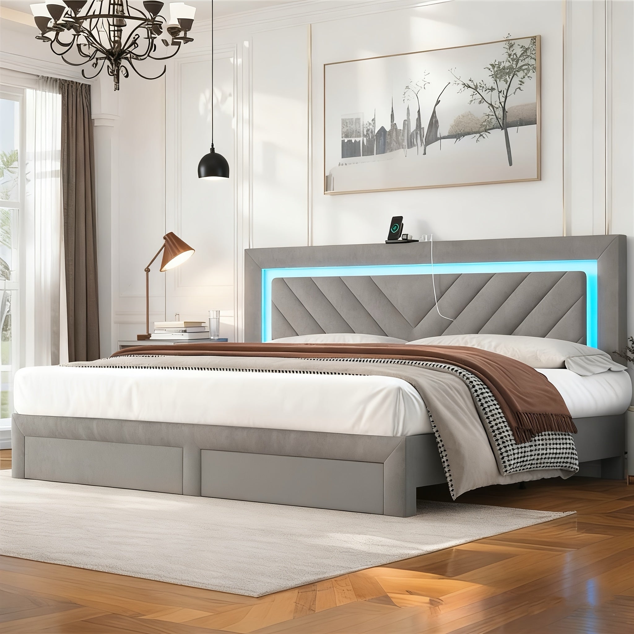 Bed Frame with Upholstery Featuring an Adjustable LED Headboard, Built-In Charging Station