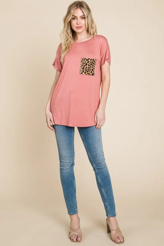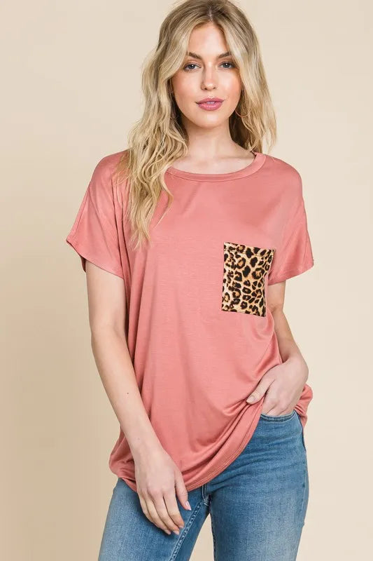 The Leopard Chest Pocket Tee features a trendy leopard print on the chest pocket, adding a touch of wild flair to your outfit. Made from soft and comfortable fabric, it ensures all-day comfort and style. This versatile tee can be easily dressed up or down for various occasions.