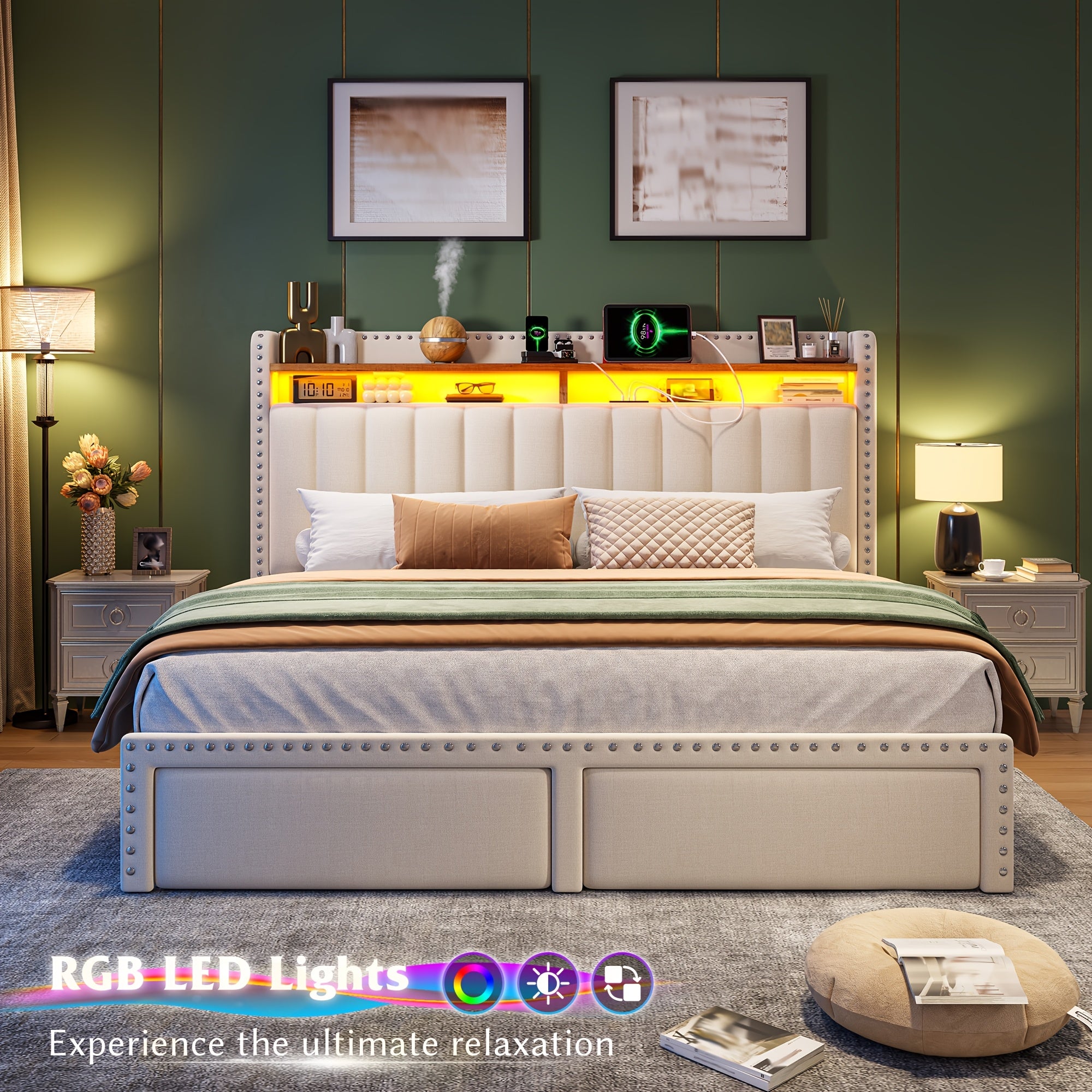 Color-Controlled Bed Frame With Light Strip And Socket, Three Sizes Available