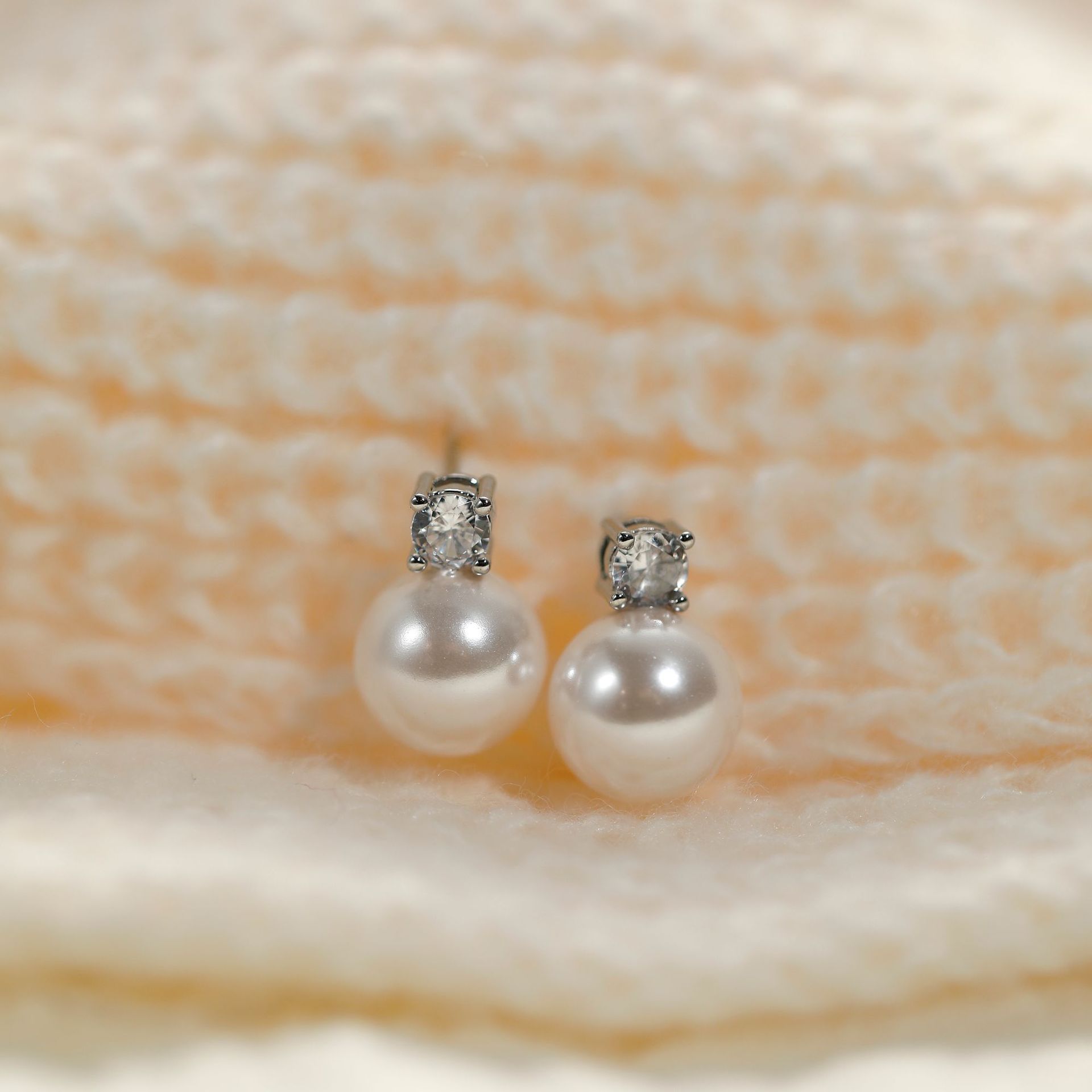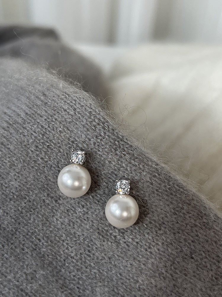 Copper Plating Single Zircon Pearl Silver Stud Earrings