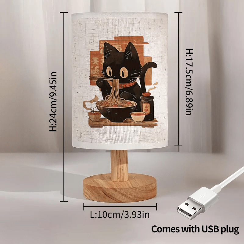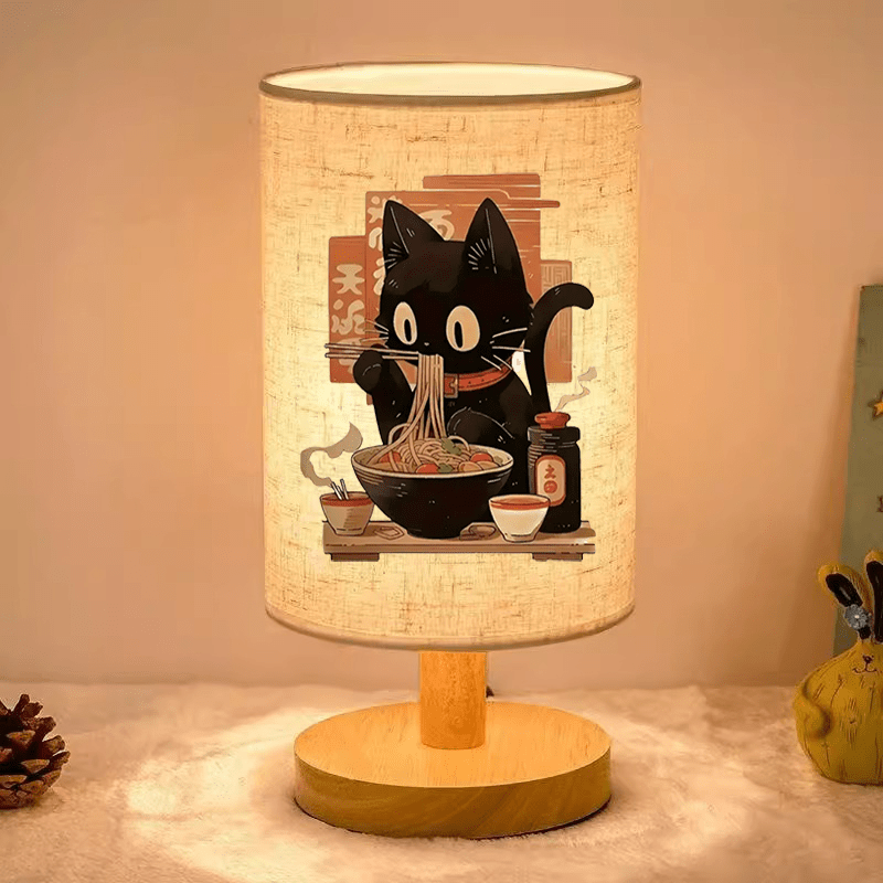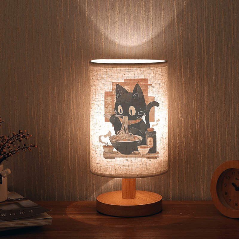 Cute Black Cat Eating Ramen Print LED Bedside Lamp - Nordic Wooden Desk Light with Fabric Shade
