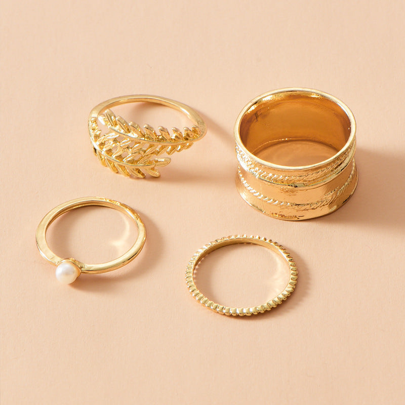 Fashion Gold-plated Leaf Pearl Ring Set, Ladies Street Shooting All-match Ring