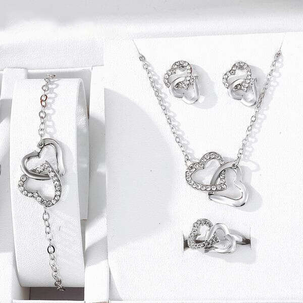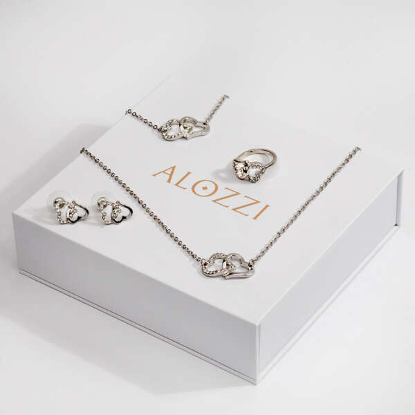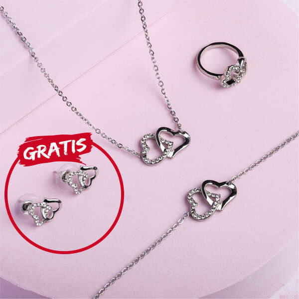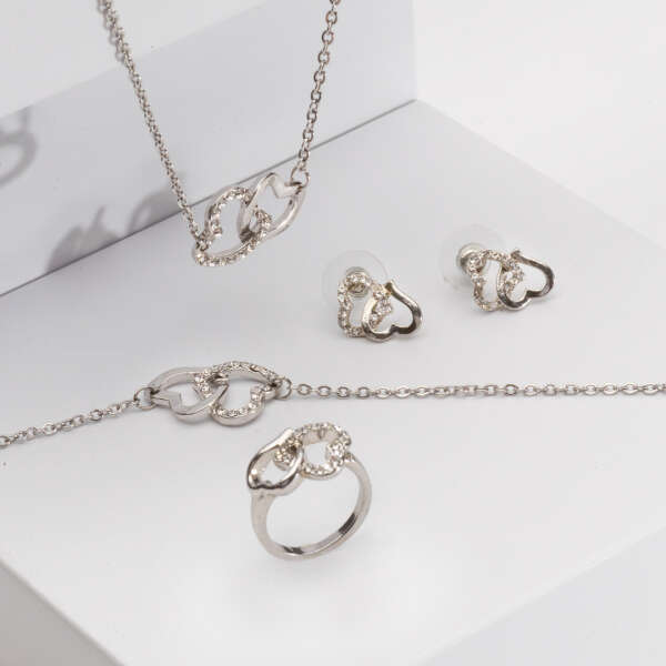 Product description: Fidda is a jewelry set which consists out of a necklace, bracelet, earrings, and ring. The set is designed with elegance in mind and can be paired with different clothing. The ring from the set is adjustable. The jewelry is decorated with heart motifs. The set is available in silver colour.