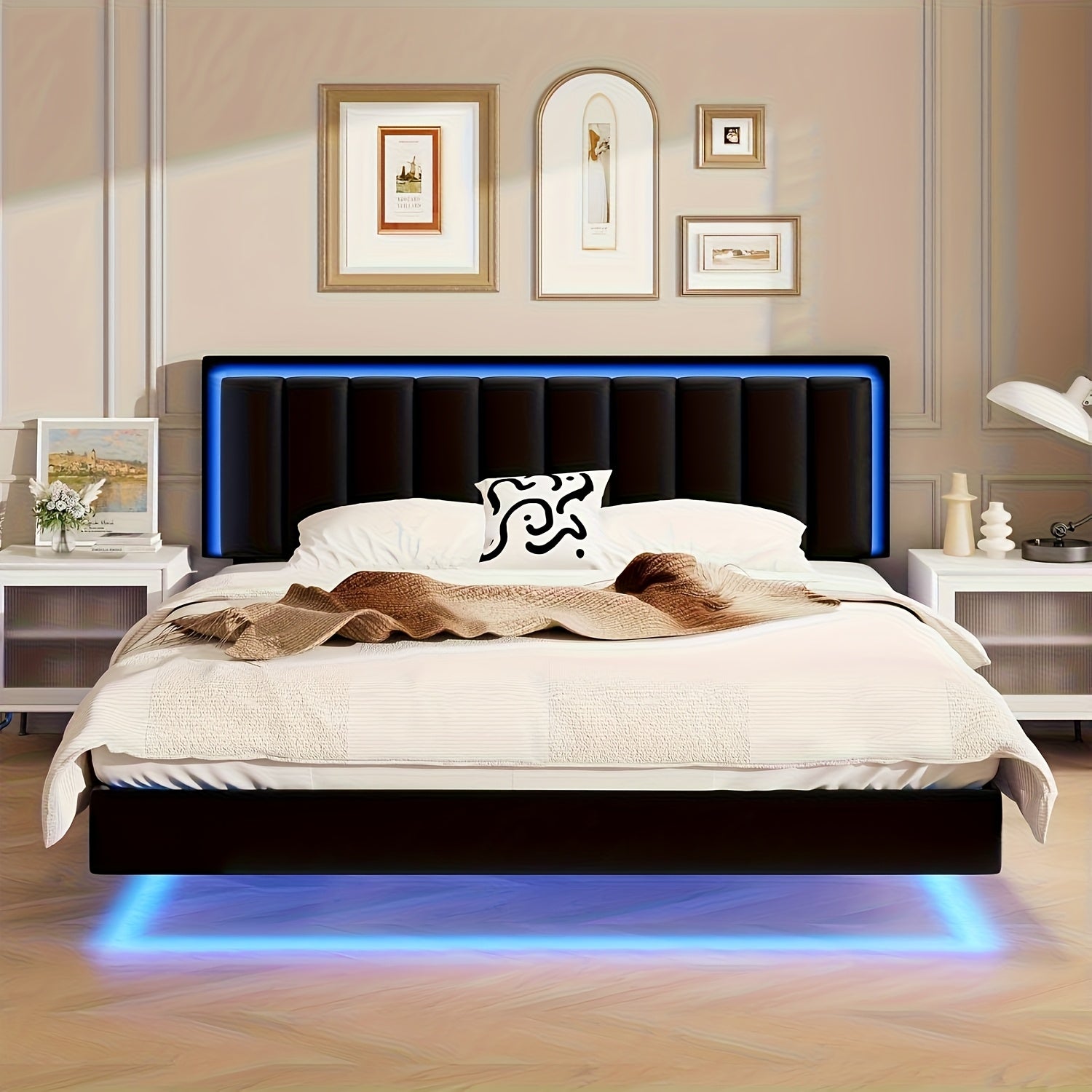 Floating Bed Frame with RGB LED Lights | Upholstered Headboard, Solid Wood Slats Support, No Box Spring Needed,