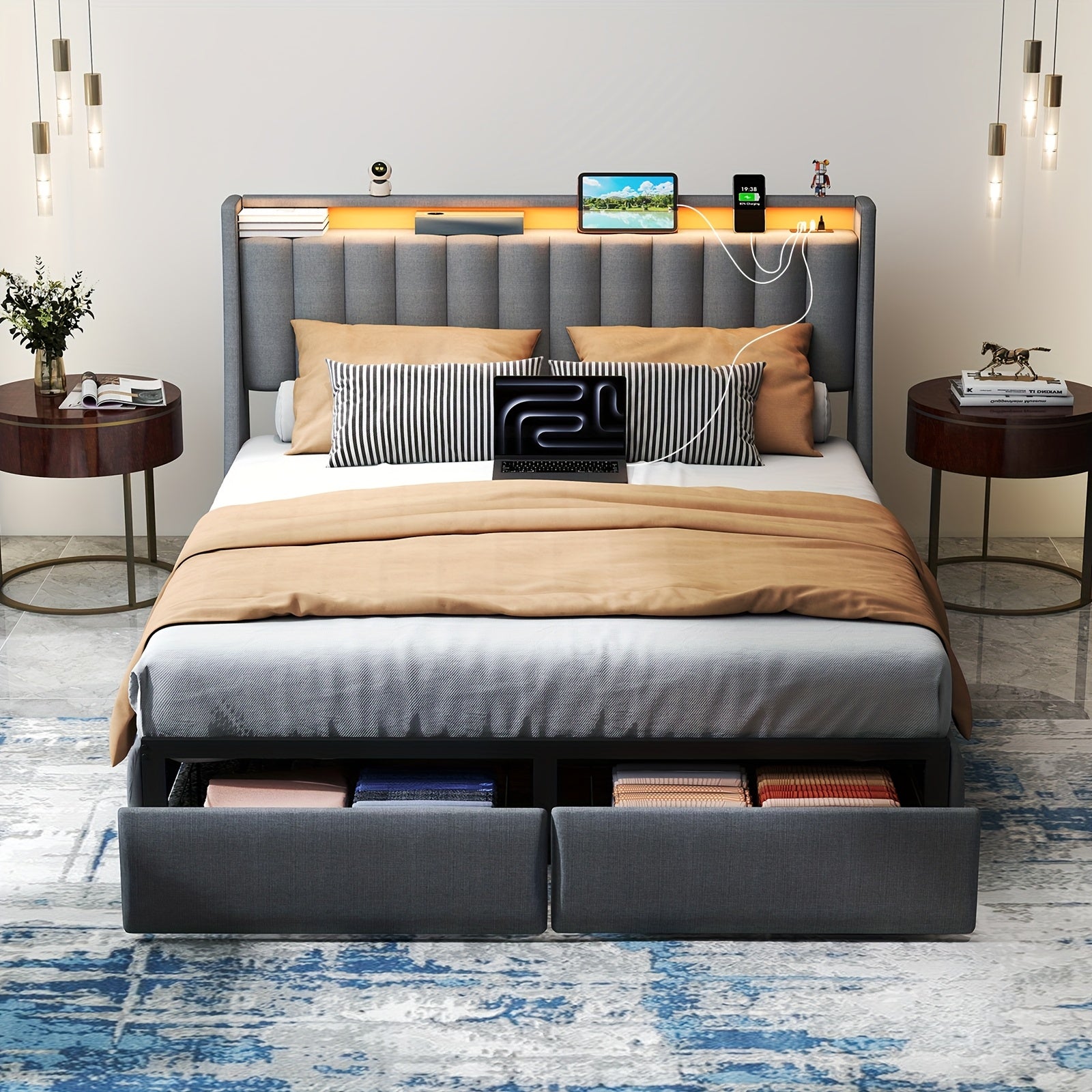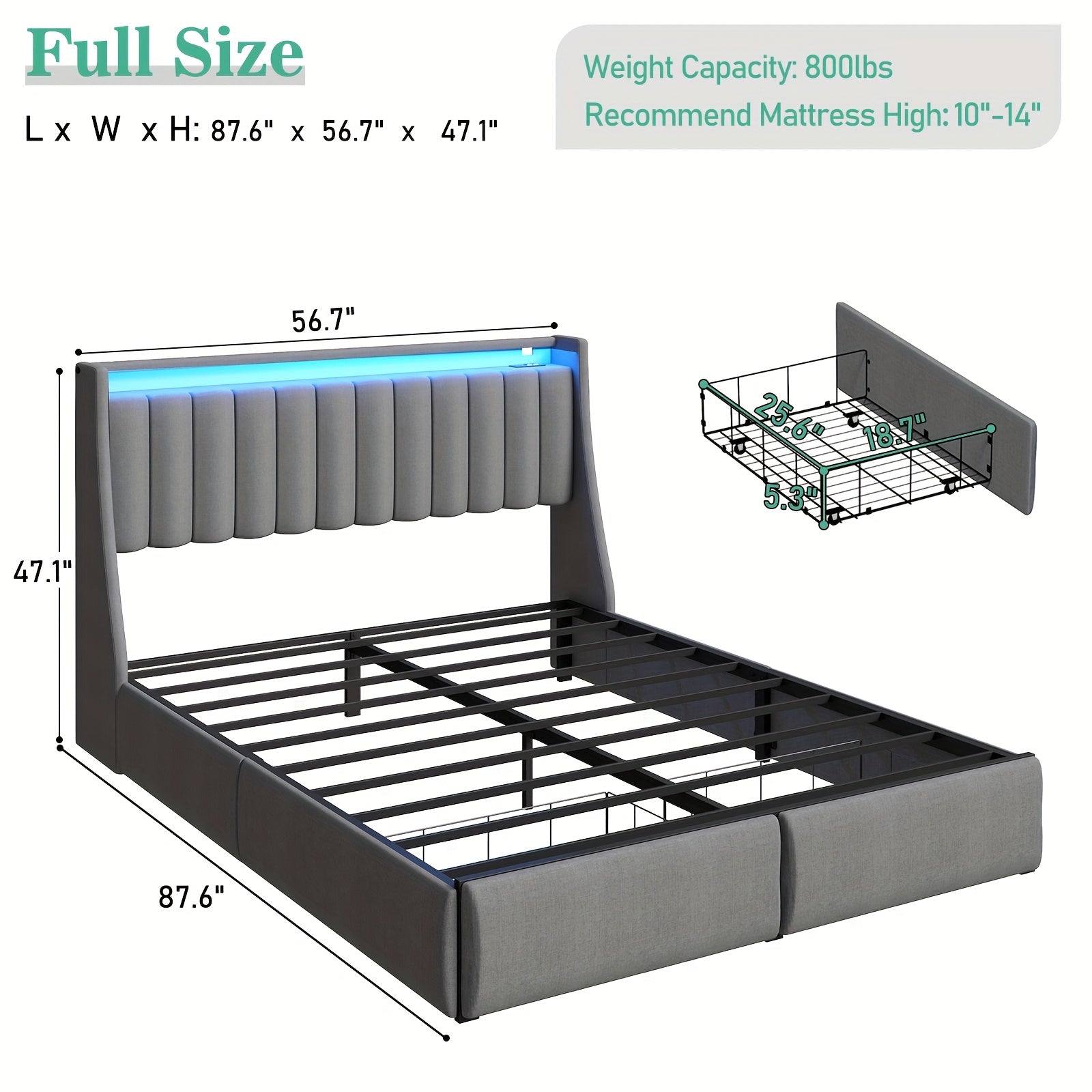 Full Queen King Bed Frame with 2 Storage Drawers And Luxury Wingback Upholstered Button Tufted Storage