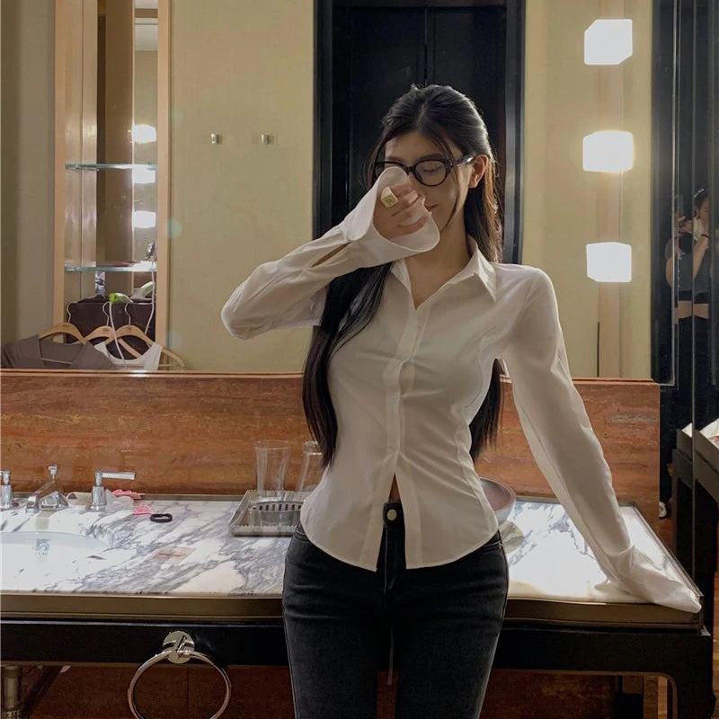 Gidyq Fashion Women Bandage Shirts Korean All Match Streetwear Female Slim Blouse Spring Casual White Bell Sleeve Shirt New