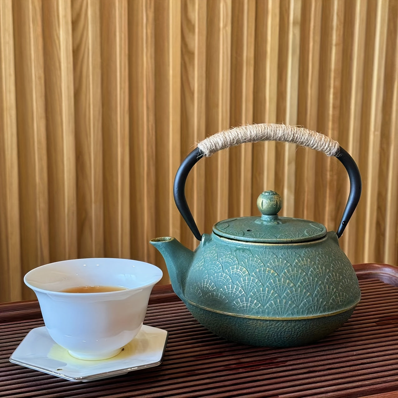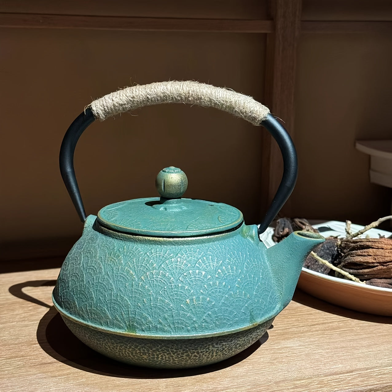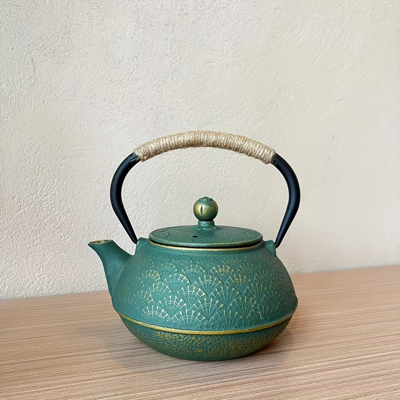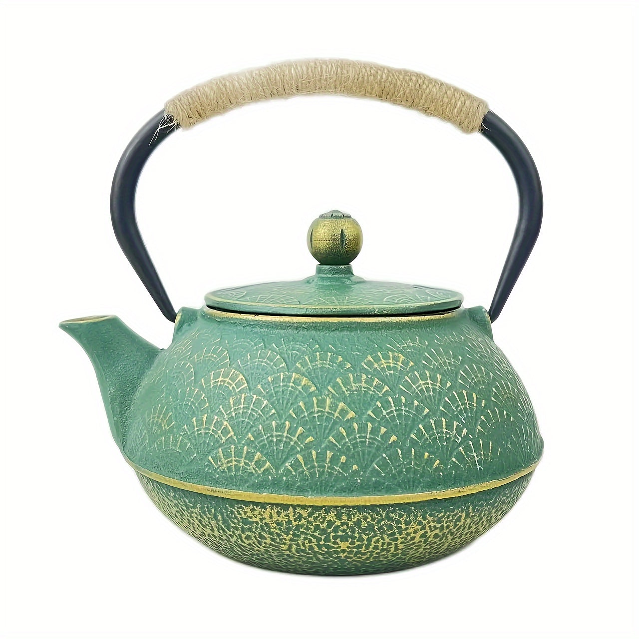Green & Golden Fan Pattern - Cast Iron Enamel Teapot - Stainless Steel Infuser With Removable Filter