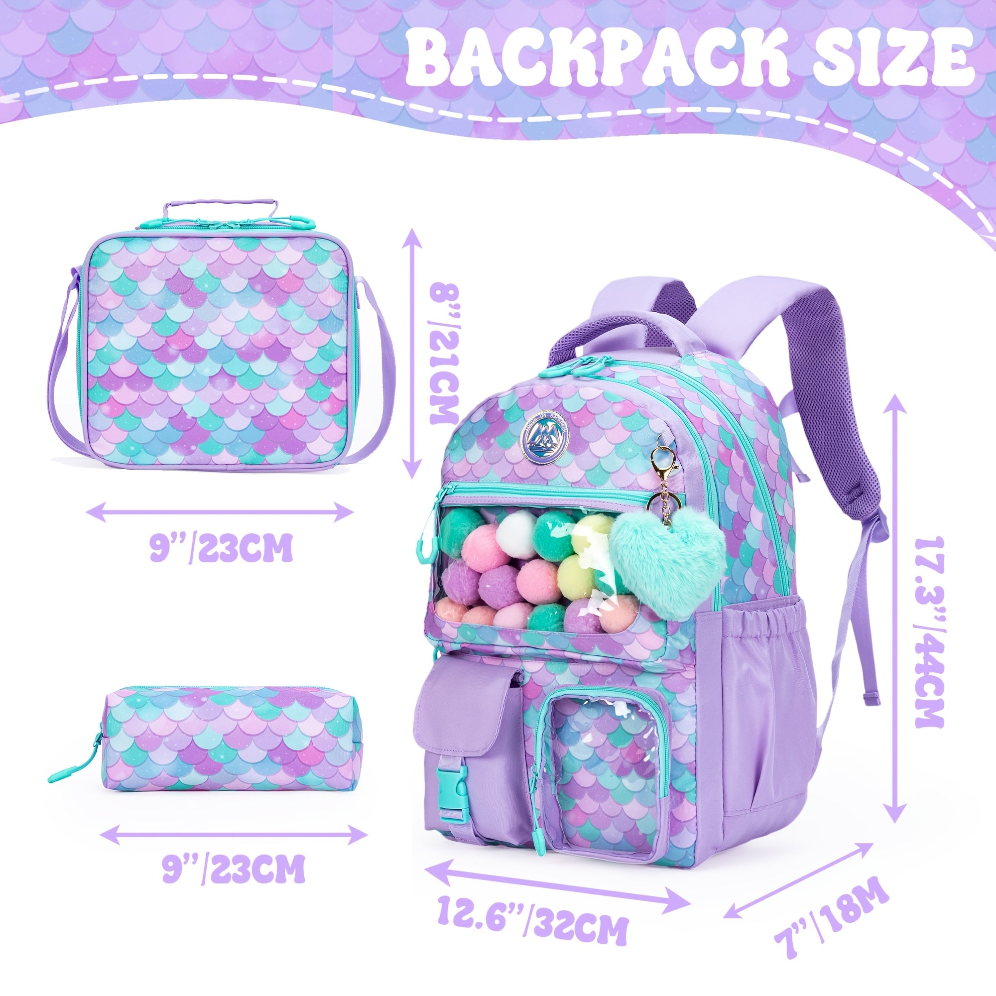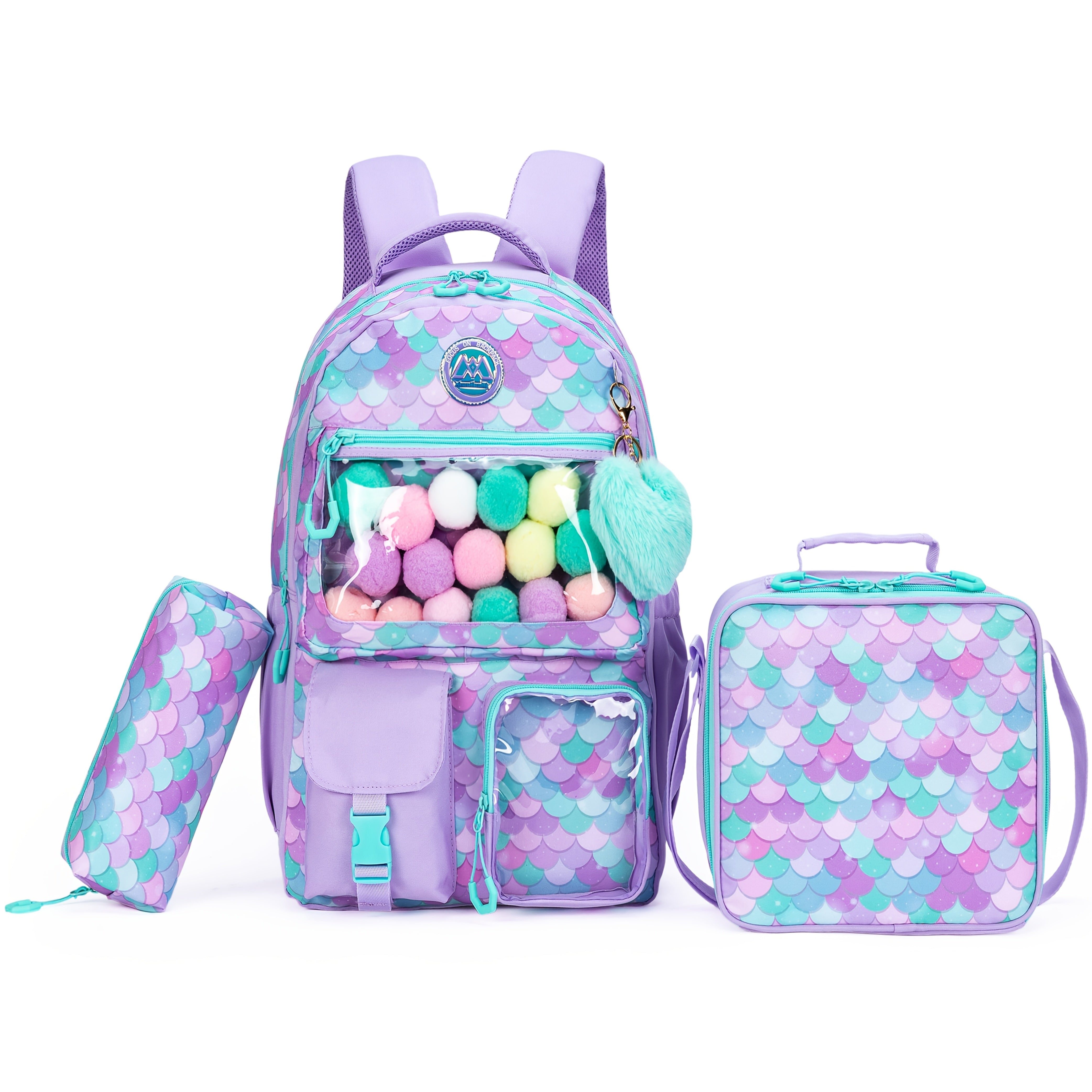 Heart-Shaped Fish Scale Backpack Set for Children and Students Features Cute Plush Balls, Zipper