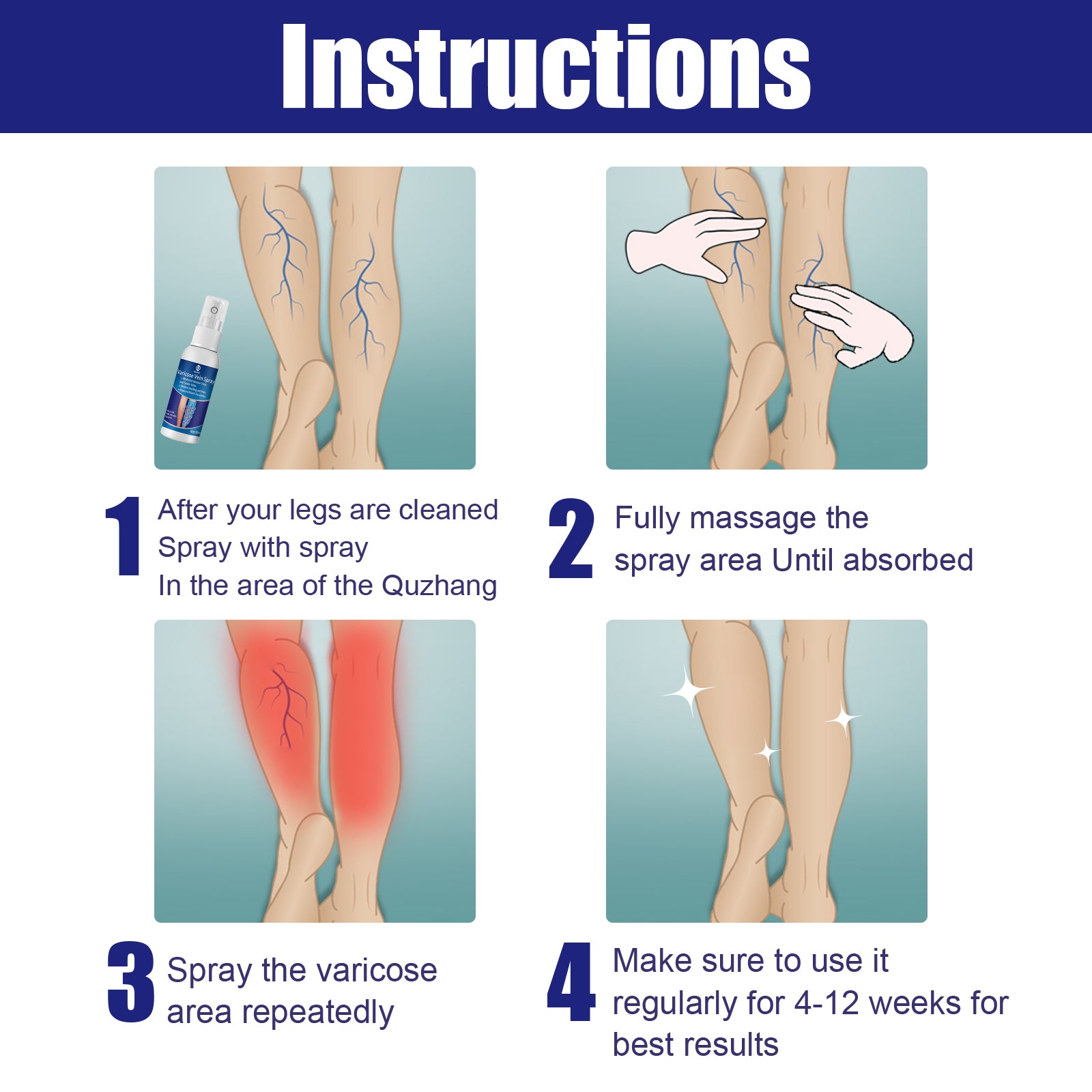 Our IV spray contains arnica flower extract, ginger extract. It can reduce and eliminate spiders and varicose veins, helping to improve blood circulation and capillary health. Its use is simple: after cleaning the legs, spray the varicose area with a spray and massage it thoroughly, spray the area until absorbed, and spray the varicose area repeatedly, making sure to use it regularly for 4-12 weeks for best results. It can also be massaged intravenously to relieve swelling and pain.