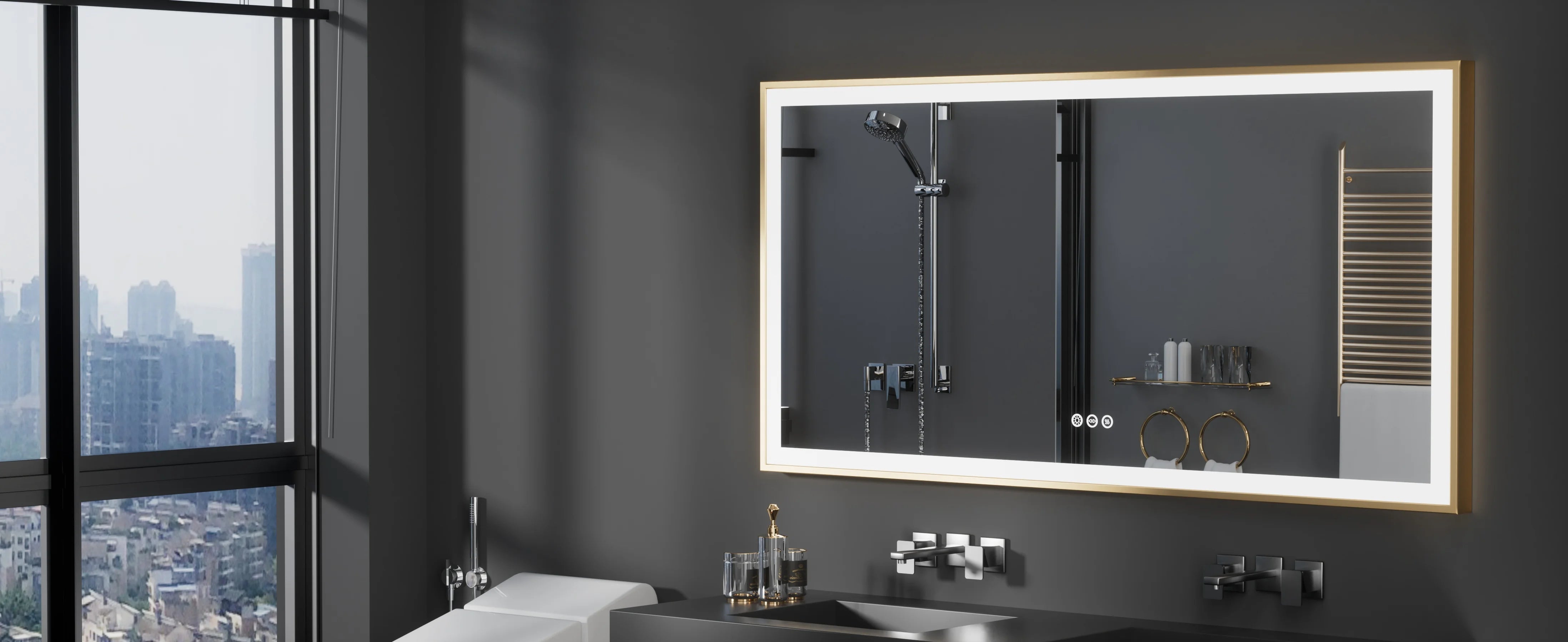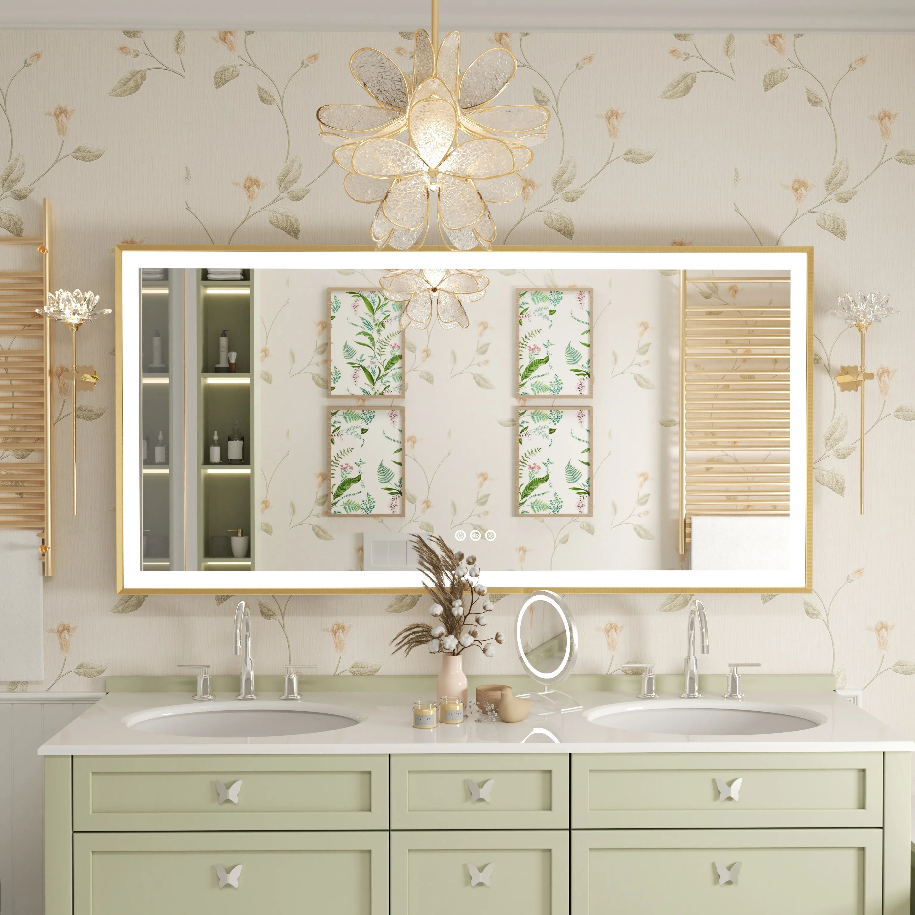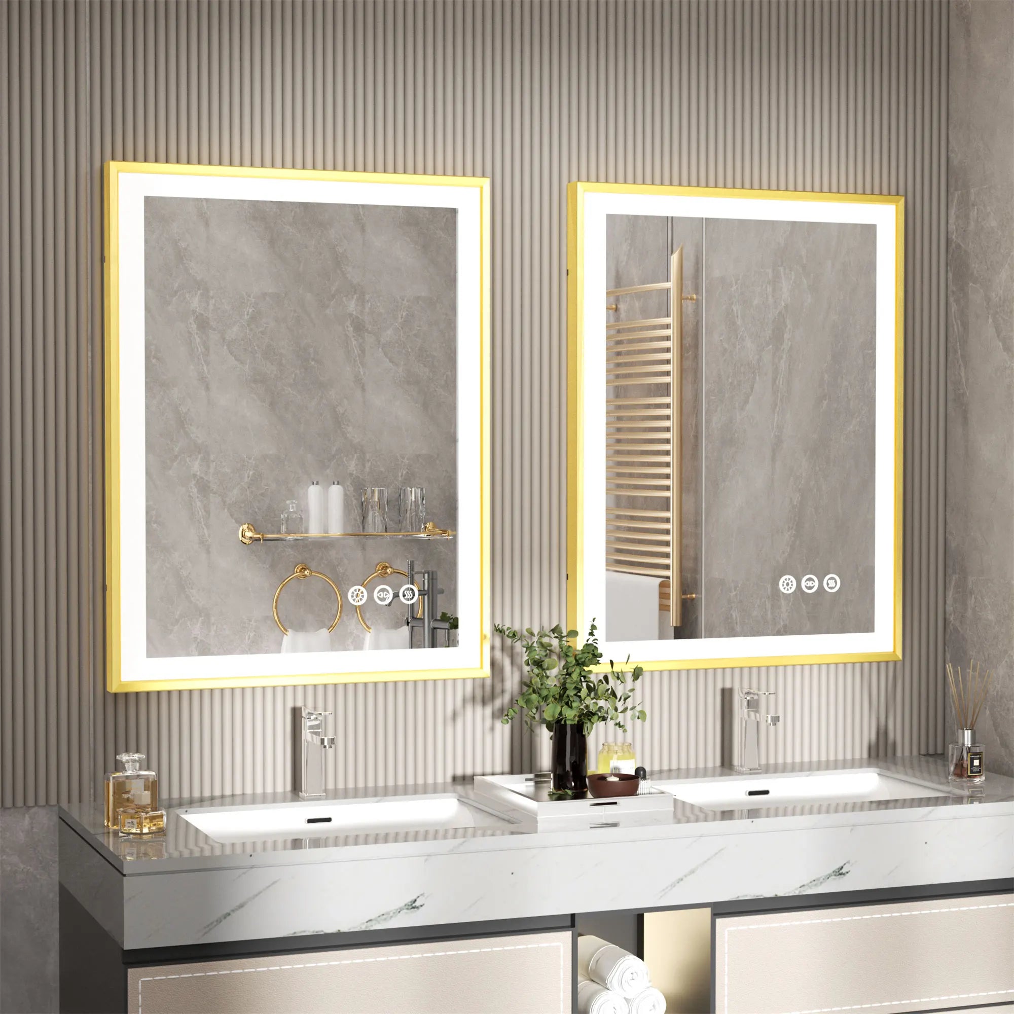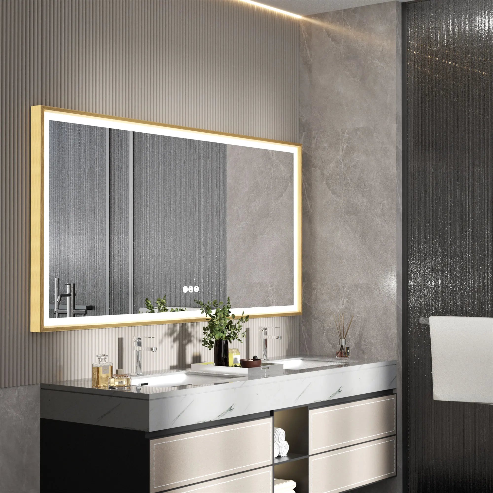 LED Bathroom Vanity Mirror Gold Frame Front Lighted Aluminum Rectangle Beveled Edge Tricolors Stepless Dimmable