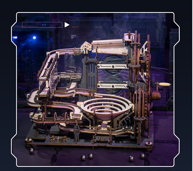 Multiple tracks like waterwheels, flip-flop-splitter, a funnel, S slopes, U-turn slides, trap-doors, gradient slides. Handcrank to move the marbles down on crazy tracks!