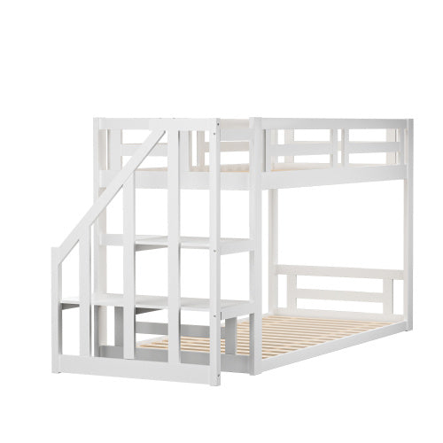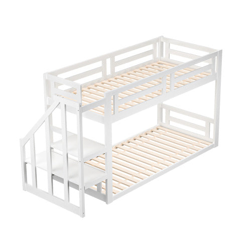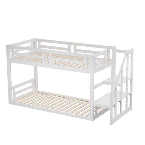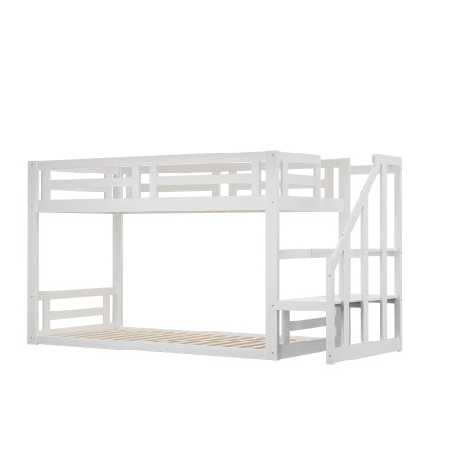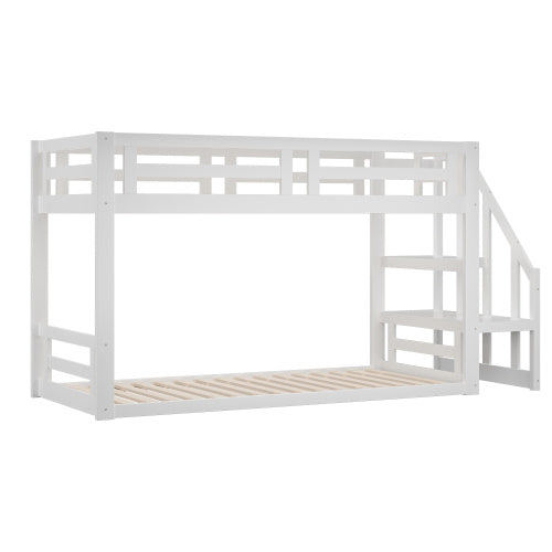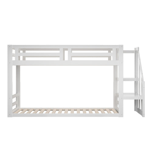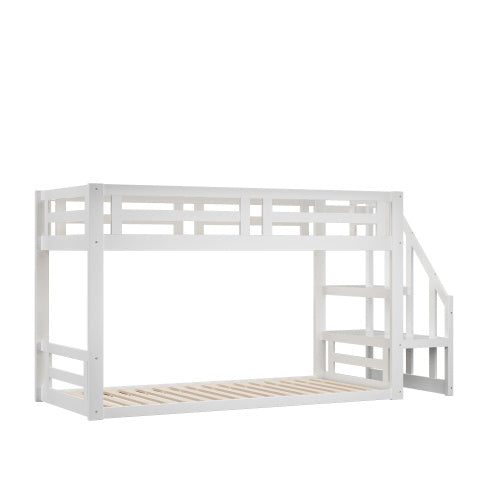 Product Name:Kinderbett 90*200cm, Niedriges Etagenbett mit Sicherheitstreppe, Etagenbettgestell aus Massivholz mit Lattenrost, weiß