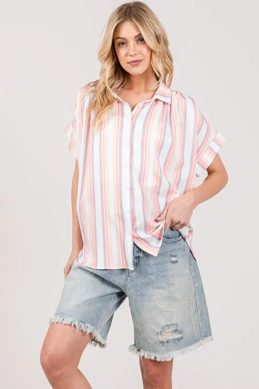 SAGE+FIG Plus Size Multi Stripe Button Down Short Sleeve Shirt