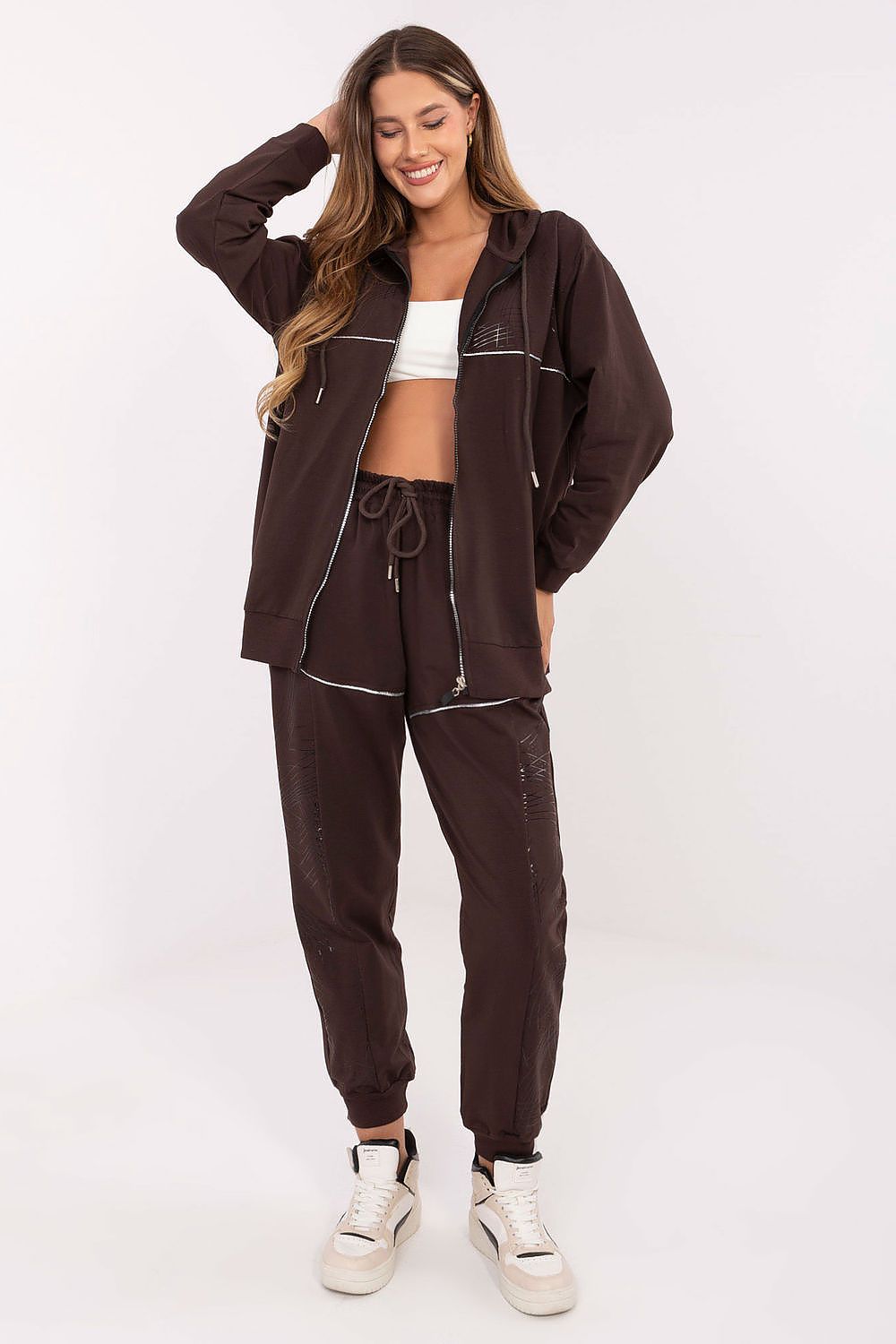 Women's tracksuit set in casual style, perfect for everyday occasions. Made of cotton with elastane for comfort and freedom of movement. The zip-up hoodie has a practical hood and slip pockets, and the subtle print adds a trendy character to the whole. The long-legged pants with cuffs have a high waist and a waist tie for a perfect fit. The slip pockets on the sides make the set not only comfortable but also functional. A perfect choice for women who appreciate style and comfort in one.
