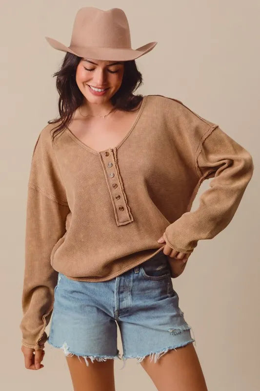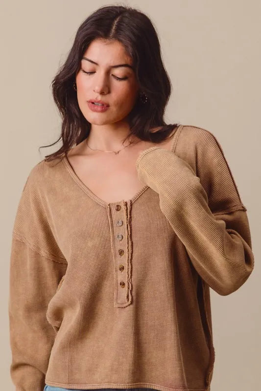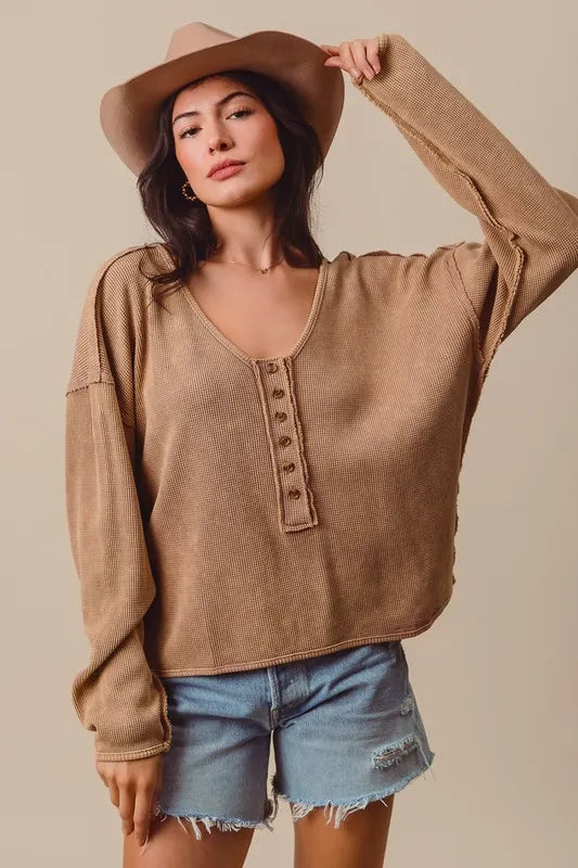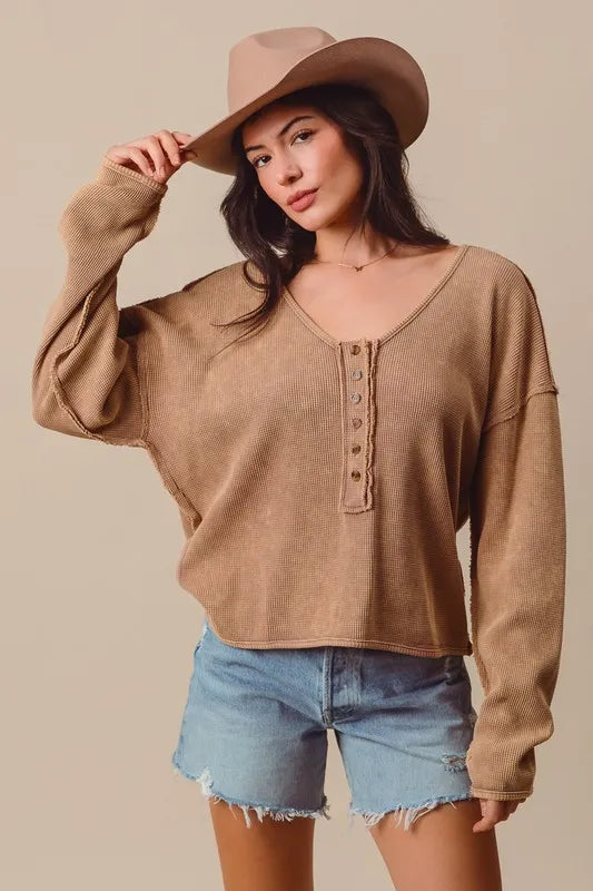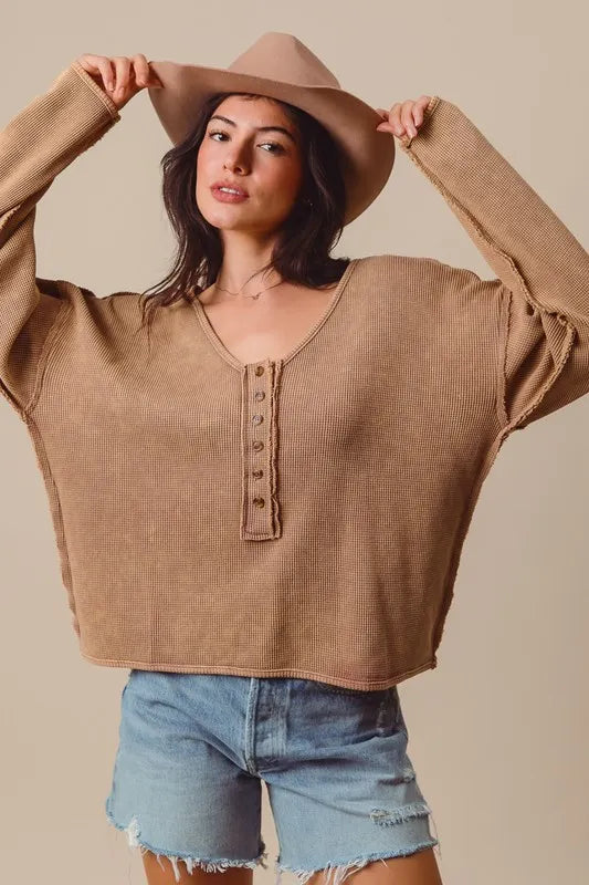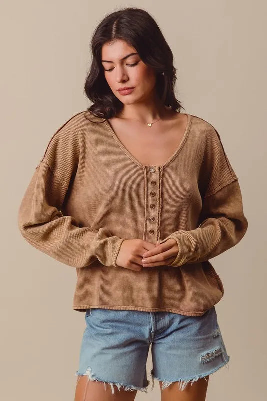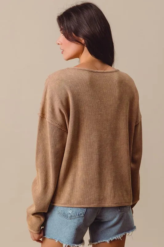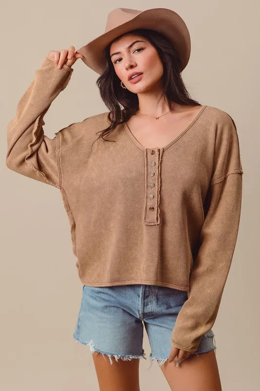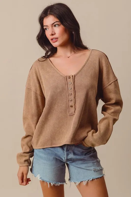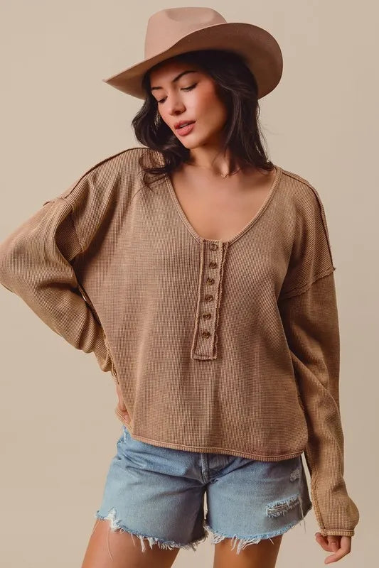 A frayed cut mineral washed deep V-neck waffle top is a trendy and stylish piece. The mineral wash gives the fabric a vintage look, while the frayed cut details add an edgy touch. The deep V-neckline creates a flattering silhouette.