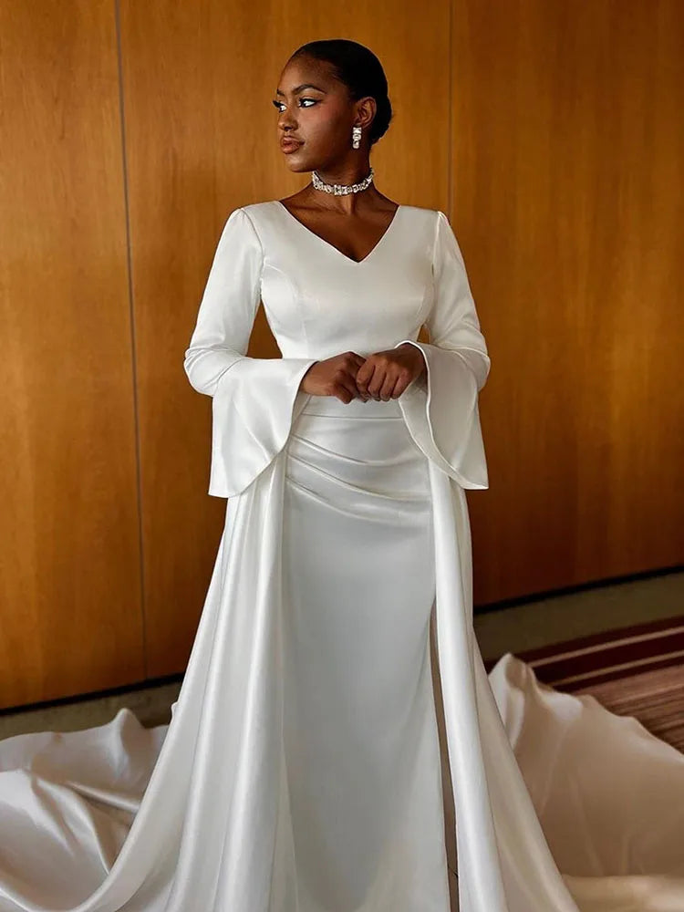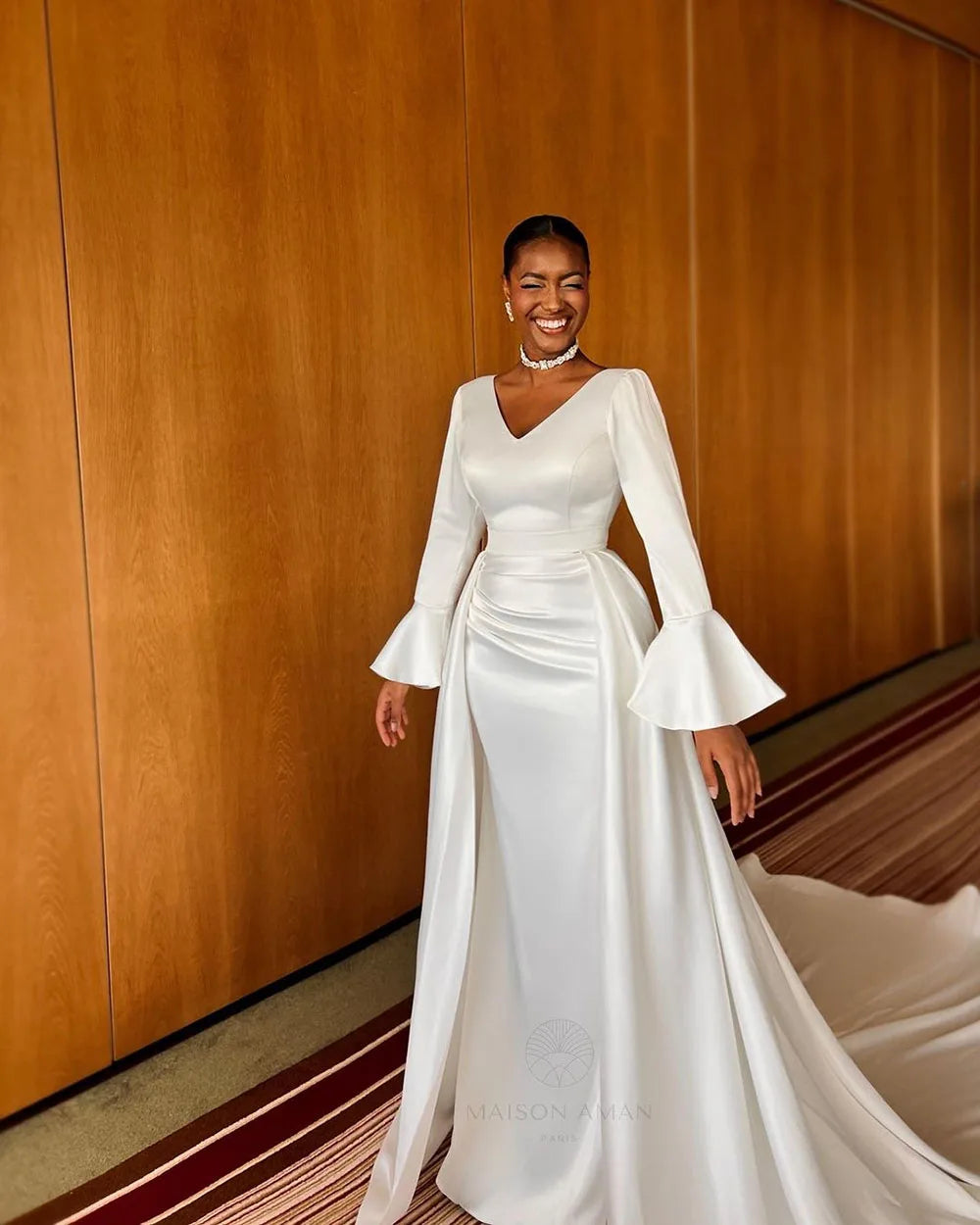 SoDigne Exquisite Muslim Wedding Dresses V Neck Bride Dresses Long Sleeves Satin Wedding Gown vestidos de novia Customized