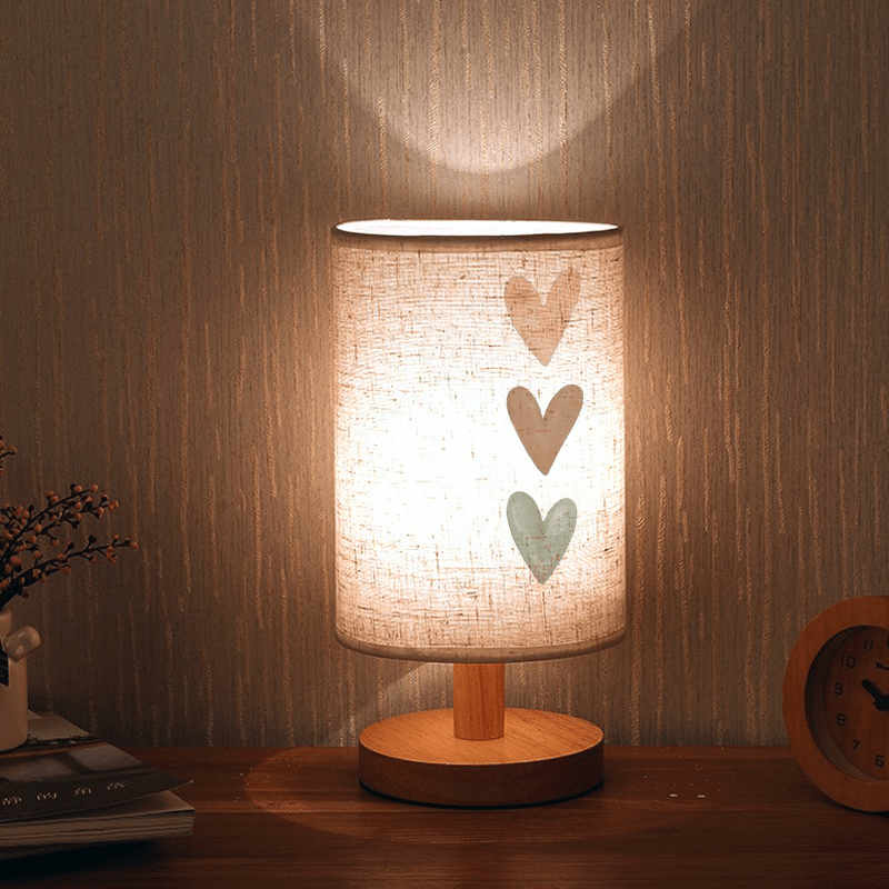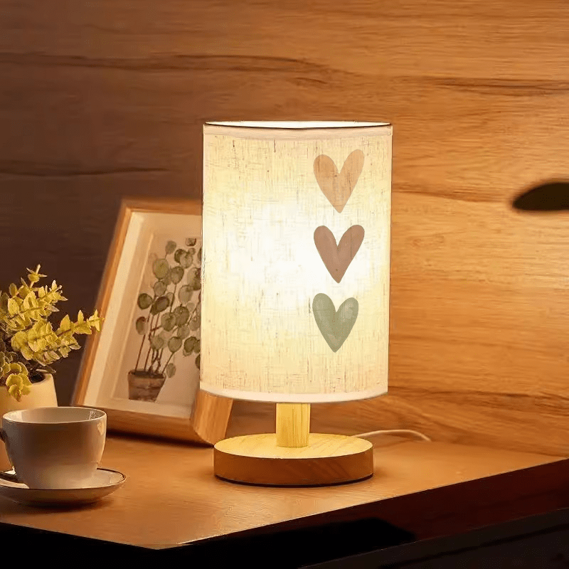 Three Heart Print Ambient Bedside Lamp, Wood Tone Table Lamp with Fabric Shade for Bedroom
