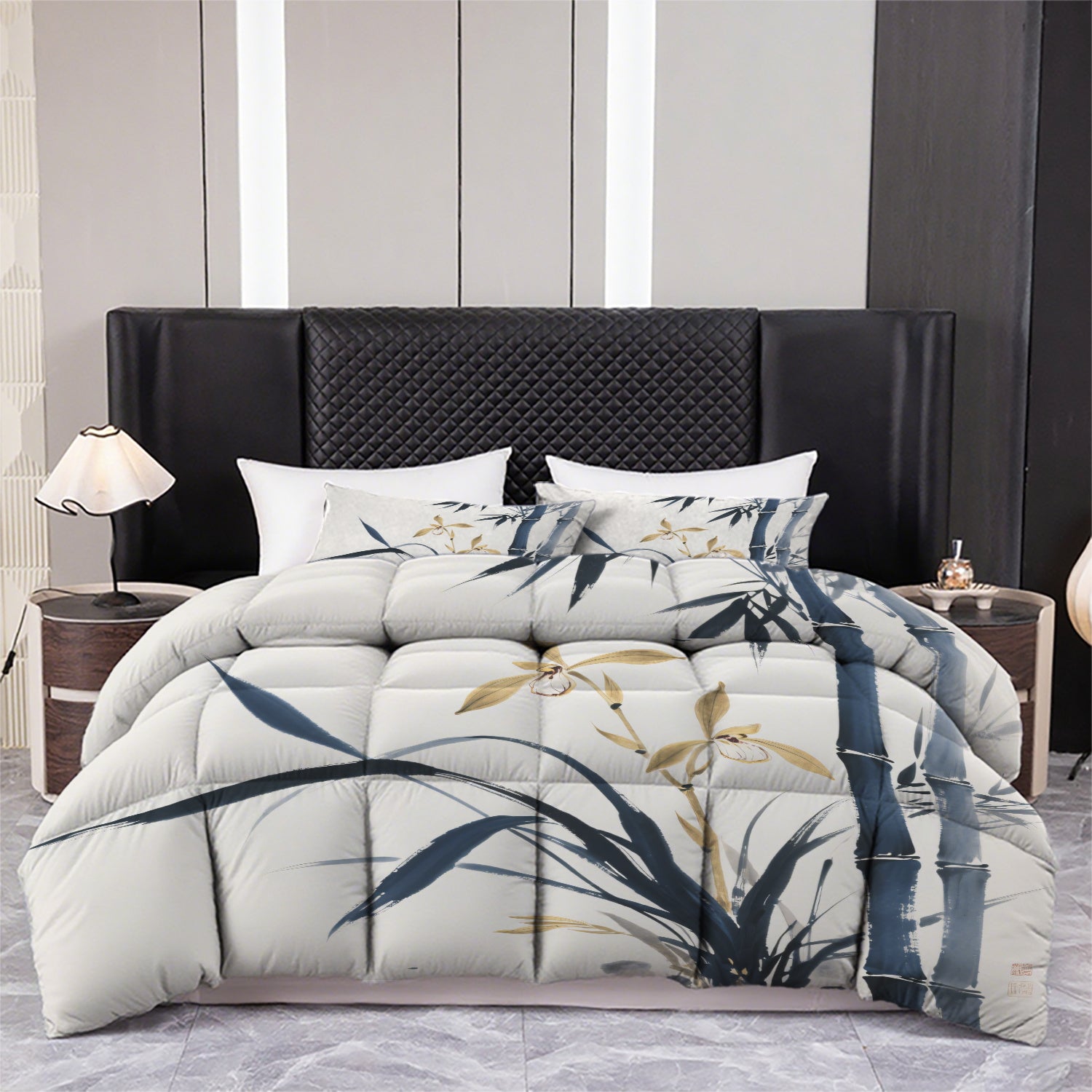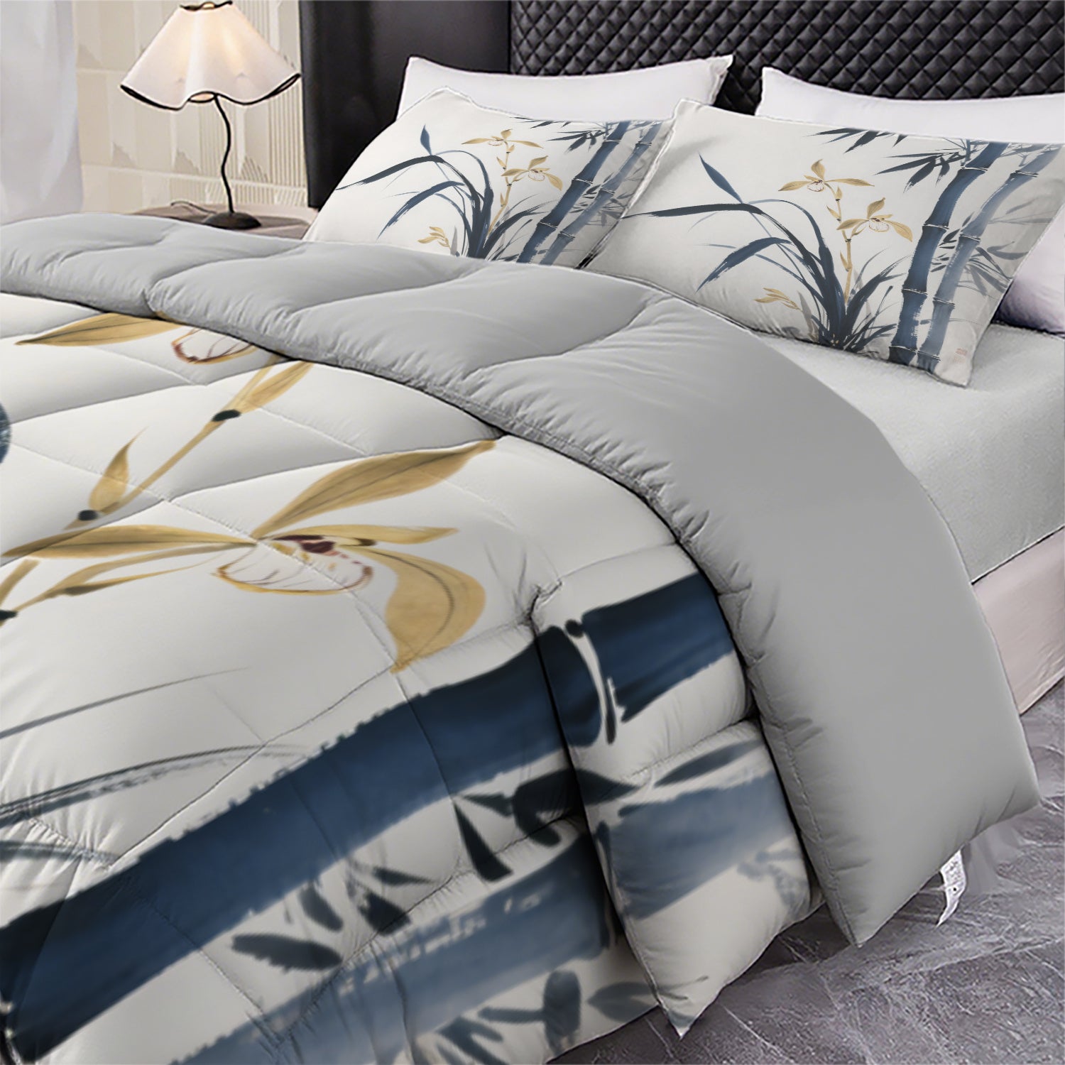 Three-Piece Printed Bedding Set (1 Quilt + 2 Pillow Covers) - Zen Orchid Bamboo Floral Design