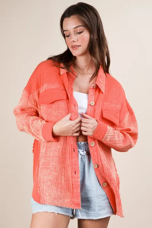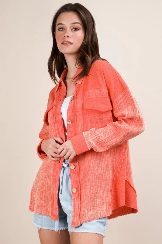 The Mineral Washed Oversized Gauze Shacket is typically made from lightweight and breathable fabric such as cotton or linen. The mineral washing process gives the garment a unique and slightly vintage look, while the oversized fit adds a relaxed and casual vibe. This shacket combines the elements of a shirt and a jacket, making it versatile for layering. The gauze material provides comfort and is suitable for wearing in various weather conditions. Pair it with jeans and a basic tee for a laid-back look, or layer it over a dress for a stylish twist. This shacket is a great addition to your casual wardrobe for an effortlessly cool outfit.