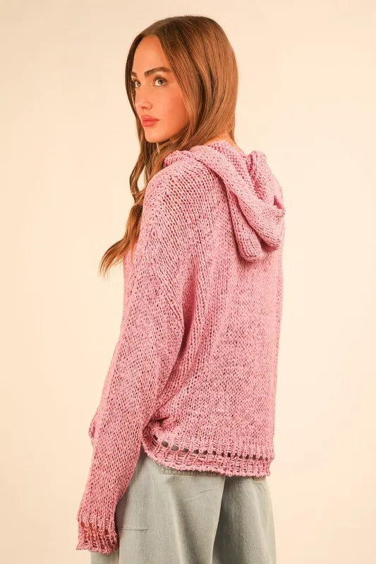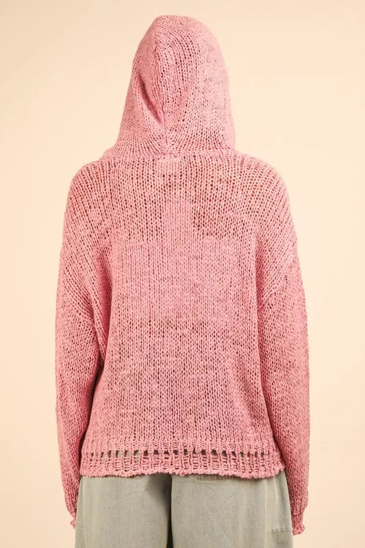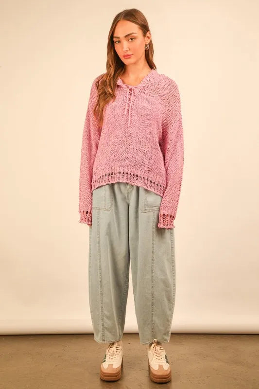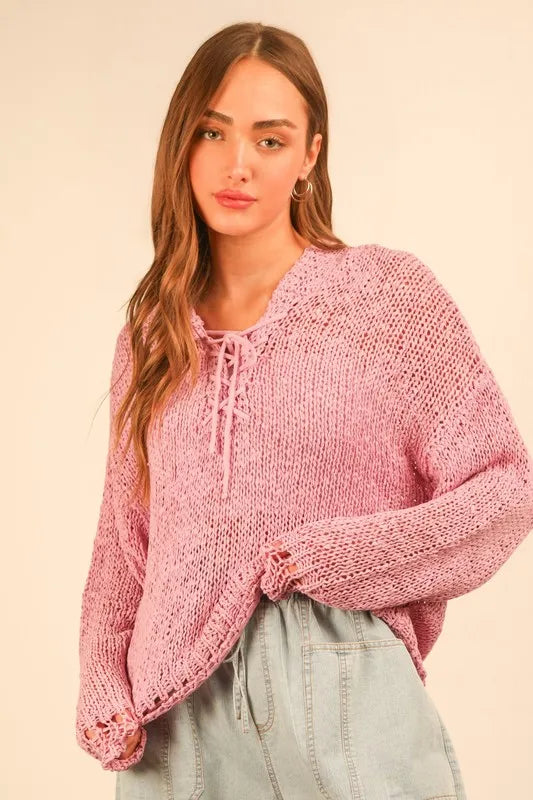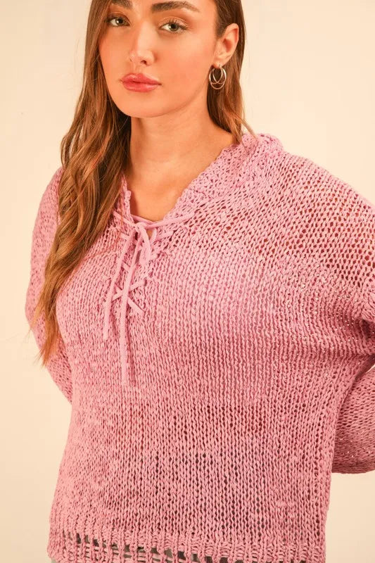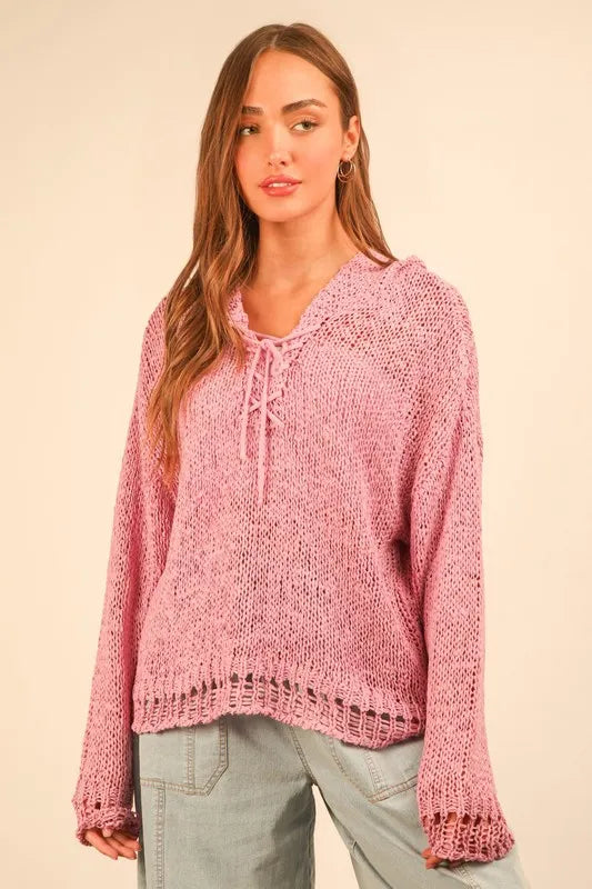 VERY J Oversized Openwork Lace Up Hooded Sweater