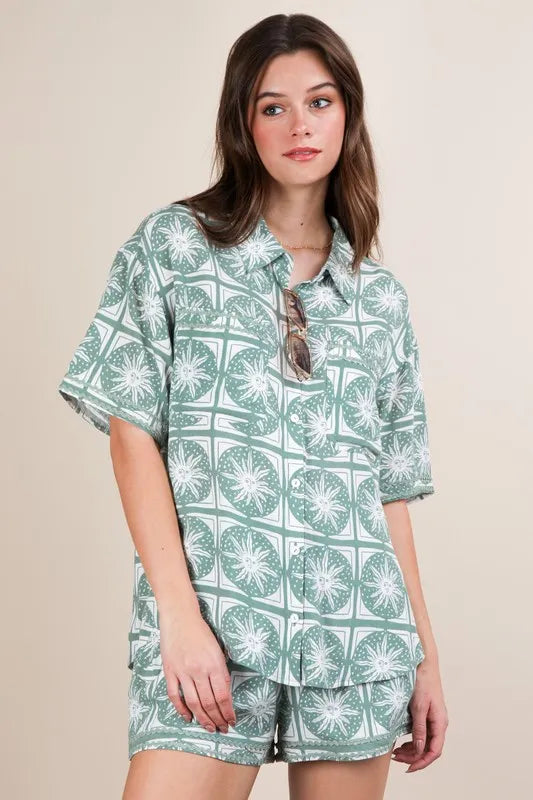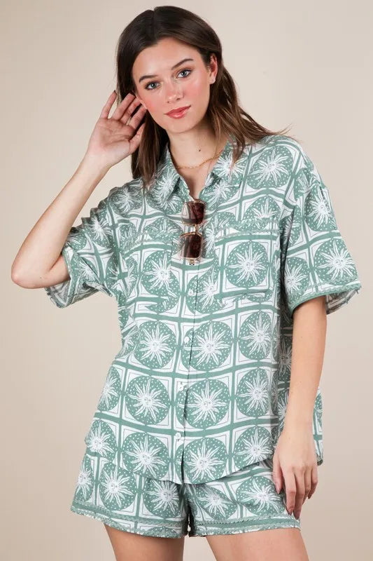 A tropical printed shirt top and shorts set is a stylish and coordinated outfit choice for warm weather. The vibrant print evokes a vacation-ready vibe, while the matching top and shorts create a cohesive and put-together look. This set is perfect for beach days, summer outings, or tropical getaways. Pair it with sandals and sunglasses for a trendy and effortless ensemble.