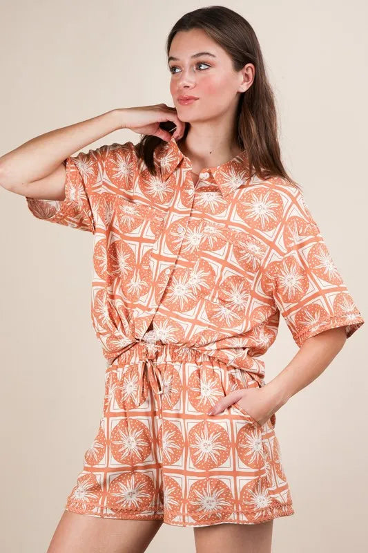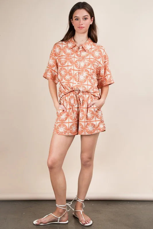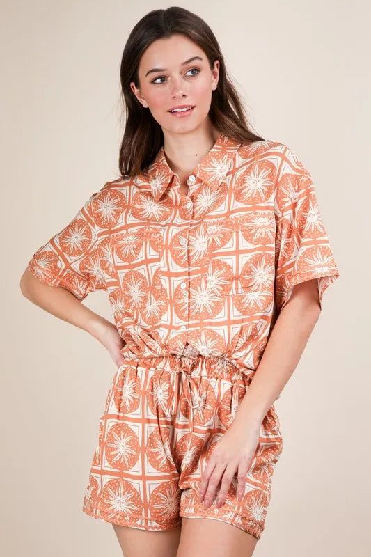 A tropical printed shirt top and shorts set is a stylish and coordinated outfit choice for warm weather. The vibrant print evokes a vacation-ready vibe, while the matching top and shorts create a cohesive and put-together look. This set is perfect for beach days, summer outings, or tropical getaways. Pair it with sandals and sunglasses for a trendy and effortless ensemble.